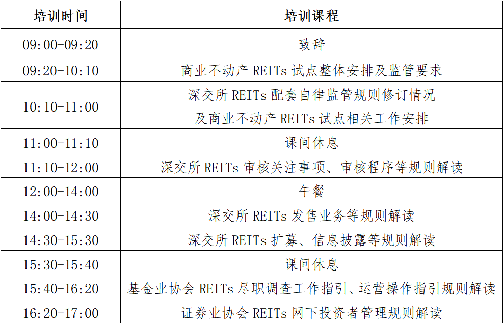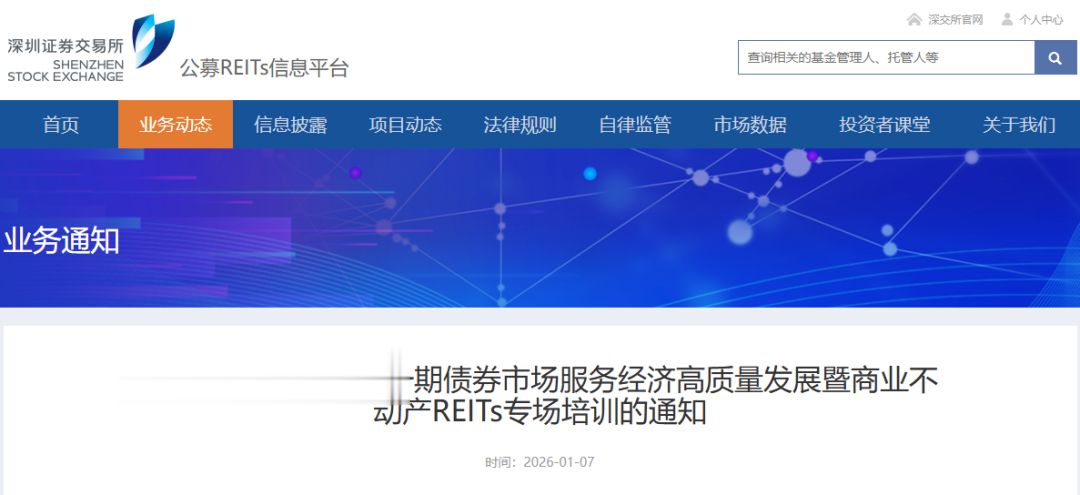 12月31日,中国证监会发布《关于推动不动产投资信托基金(REITs)市场高质量发展有关工作的通知》,出台《中国证监会关于推出商业不动产投资信托基金试点的公告》,深交所修订发布《公开募集不动产投资信托基金业务办法(试行)》及配套规则指南,推动商业不动产REITs试点平稳开局,丰富REITs业务类型,夯实商业不动产REITs制度基础。为进一步推动各市场参与人员充分了解REITs最新政策安排,深交所拟举办“2026年第一期债券市场服务经济高质量发展暨商业不动产REITs专场培训”。具体安排如下: