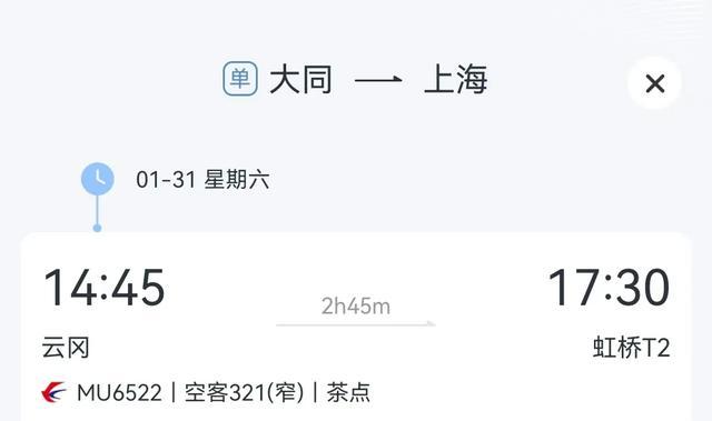 此次加密大同直飞上海虹桥航班执行日期为1月31日至3月5日,每日一班。航班具体起降时刻为:大同(14:45)—上海虹桥(17:30)、上海虹桥(10:55)—大同(13:55),航班号为MU6521/2。同时,从1月1日至3月28日,东航MU6543/4上海浦东⇌大同往返航班时刻调整为:上海浦东(17:05)—(19:35)大同、大同(20:45)—(23:15)上海浦东,每日一班。