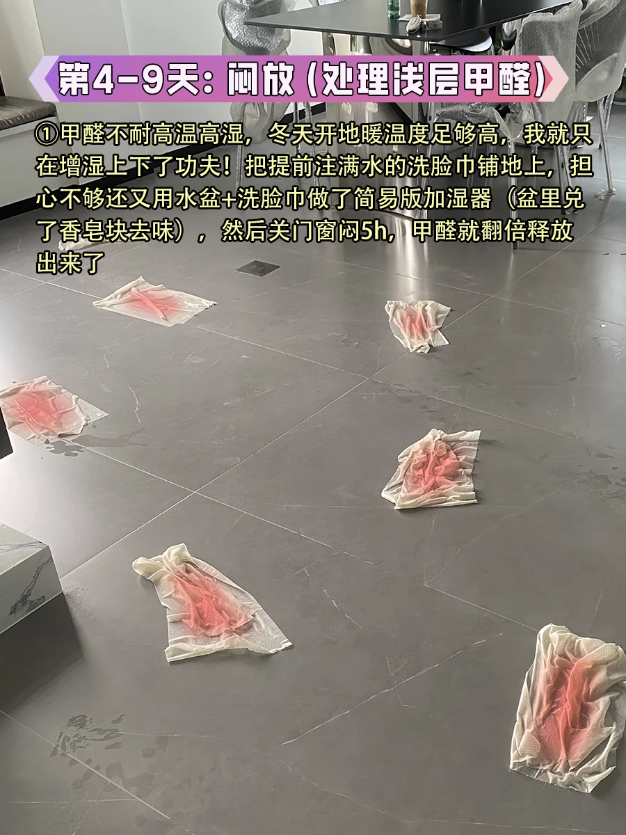 ①甲醛不耐高温高湿,冬天开地暖温度足够高,我就只在增湿上下了功夫!把提前注满水的洗脸巾铺地上💦担心不够还又用水盆+洗脸巾做了简易版加湿器(盆里兑了香皂块去味),然后关门窗闷5h,甲醛就翻倍释放出来了