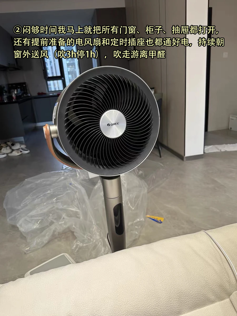 ②闷够时间我马上就把所有门窗、柜子、抽屉都打开,还有提前准备的电风扇和定时插座也都通好电⚡持续朝窗外送风(吹3h停1h),吹走游离甲醛
