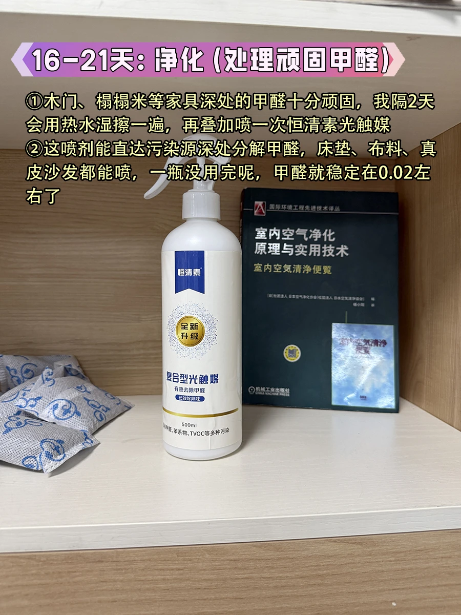 ①木门、榻榻米等家具深处的甲醛十分顽固,我隔2天会用热水湿擦一遍,再叠加喷一次恒清素光触媒