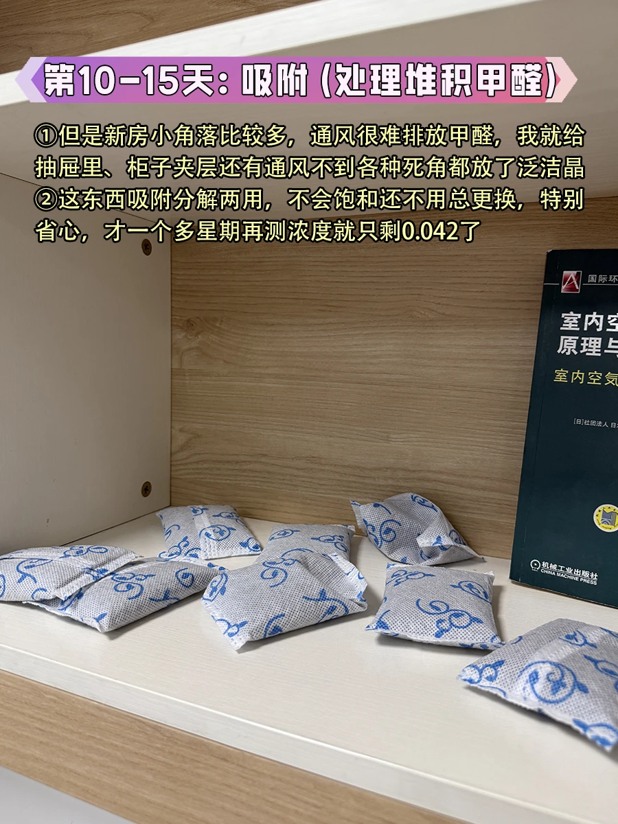 ①但是新房小角落比较多,通风很难排放甲醛,我就给抽屉里、柜子夹层还有通风不到各种死角都放了泛洁晶