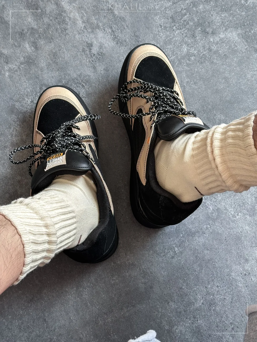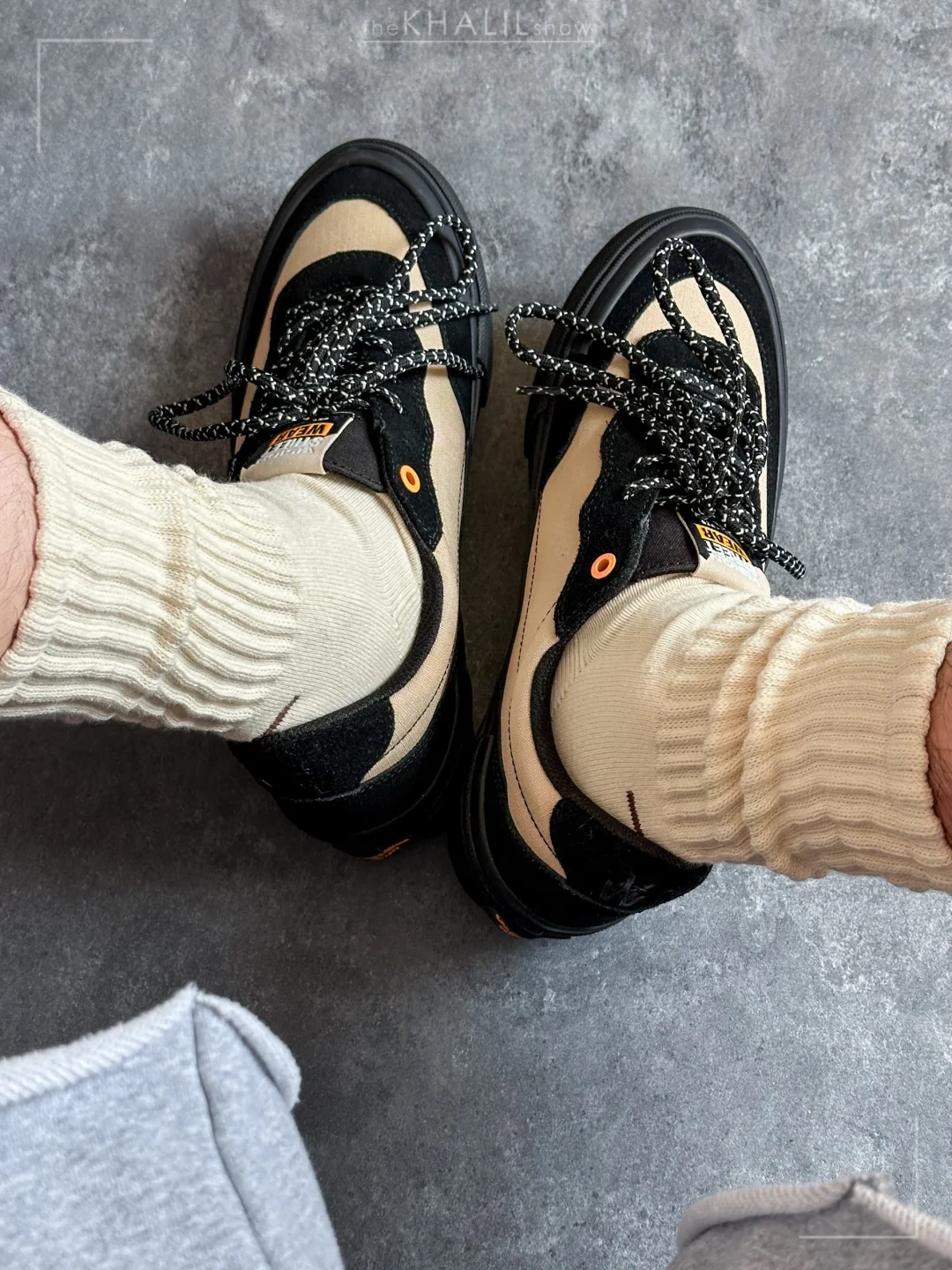 整体配色很舒服、卡其色+黑色的组合既有户外山系的风格、也对日常搭配非常友好。鞋带也采用了花色登山鞋带,配合定制亮橙色眼扣、定制BOX LOGO鞋舌、硫化橡胶大底,抓地力和时尚度拉满!