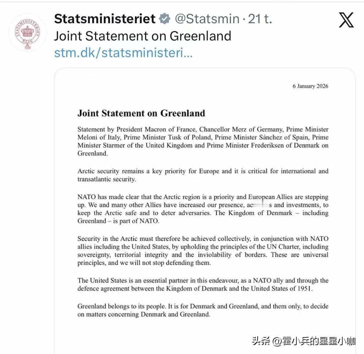丹麦、芬兰、冰岛、挪威和瑞典外交部长于2026年1月6日发表联合声明。作为北欧国