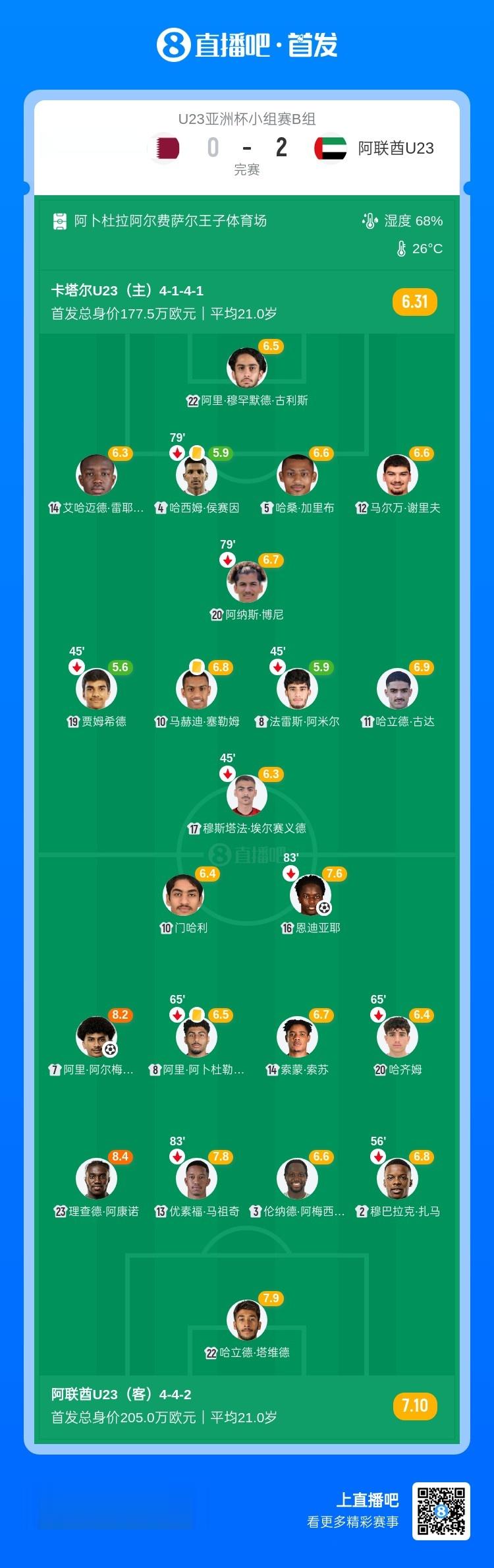 直播吧1月8日讯北京时间0:30,U23亚洲杯小组赛B组卡塔尔U23vs阿联酋U23。上半场,侯赛因开场失点,阿里·阿尔梅马里破门;卡塔尔U23打进一球,但是先出界被判无效!恩迪亚耶帮助阿联酋U23再下一城。下半场,双方均无建树。最终,阿联酋U23首战2-0击败卡塔尔U23,取得开门红。