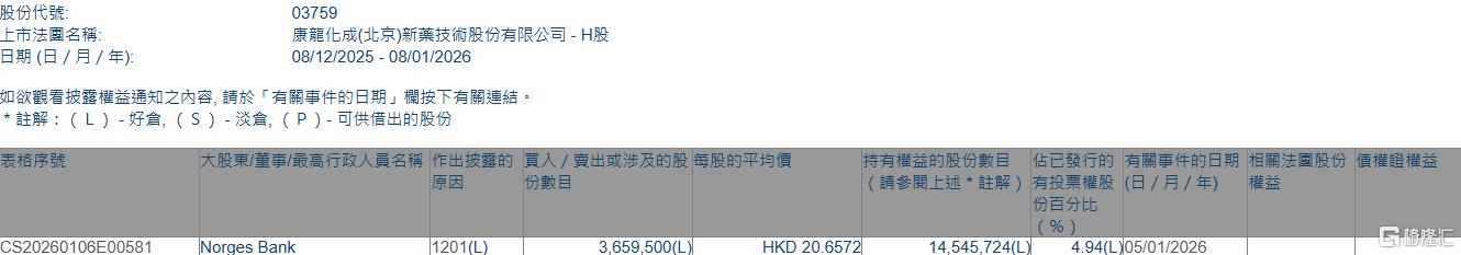 格隆汇1月8日丨根据联交所最新权益披露资料显示,2026年1月5日,康龙化成(03759.HK)遭NorgesBank在场内以每股均价20.6572港元减持365.95万股,涉资约7559.5万港元。