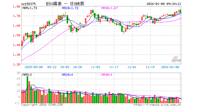 1月8日,创业板50ETF国泰(159375)开盘涨0.69%,报1.762元。创业板50ETF国泰(159375)重仓股方面,宁德时代开盘跌0.81%,中际旭创跌1.37%,东方财富跌0.98%,新易盛跌1.16%,阳光电源跌0.84%,胜宏科技跌0.07%,汇川技术涨0.47%,迈瑞医疗涨0.19%,亿纬锂能跌0.99%,同花顺跌2.01%。