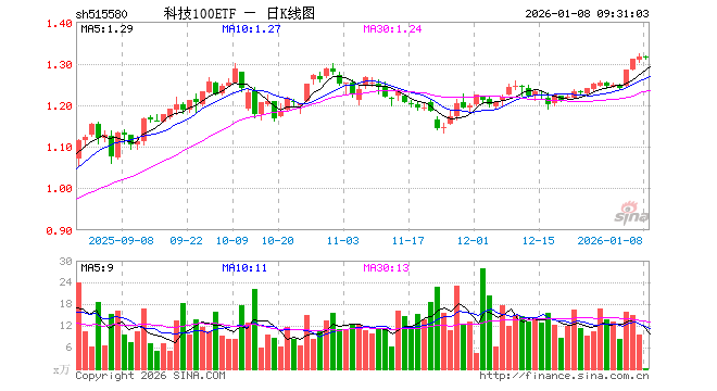 1月8日,科技100ETF(515580)开盘涨0.00%,报1.316元。科技100ETF(515580)重仓股方面,中际旭创开盘跌1.37%,阳光电源跌0.84%,海光信息涨1.46%,宁德时代跌0.81%,恒瑞医药涨1.80%,中兴通讯跌0.57%,京东方A跌0.23%,科大讯飞涨1.34%,海康威视跌0.20%,沪电股份跌0.48%。