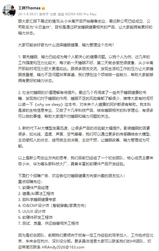 1月8日消息,前小米中国区市场部总经理、Redmi品牌总经理王腾发微博宣布:从小米离开后开始筹备创业,最近新公司已经成立,公司取名为“今日宜休”,目标是通过研发睡眠健康相关的产品,让大家能拥有更好的精力状态。