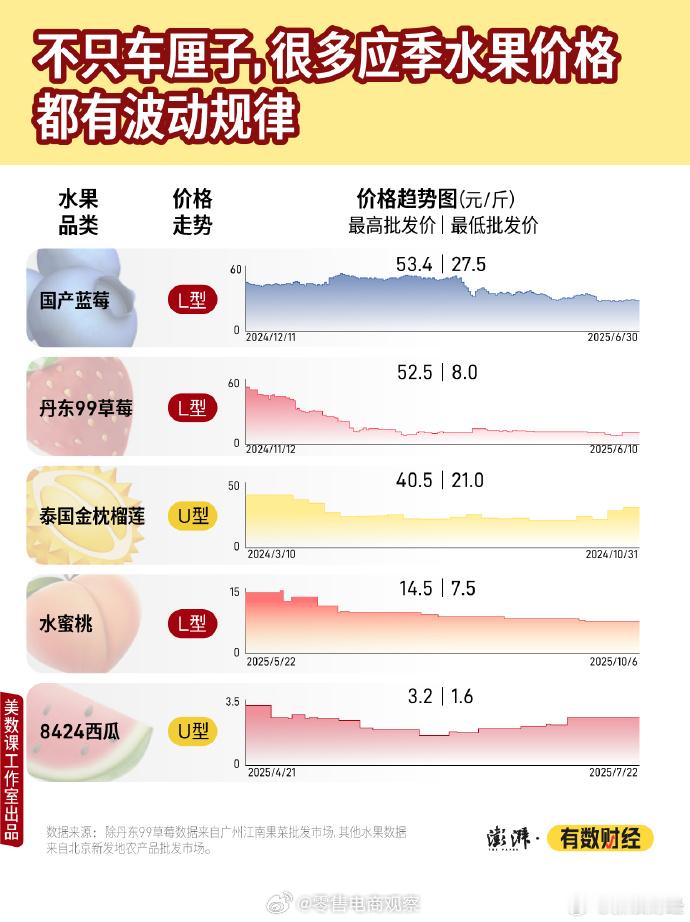【为何车厘子价格波动这么大】应季水果何时买最划算 最早国内上市的车厘子多是走空运,运输成本较高。通过查询智利海关披露的数据可以发现,2025年10月智利向中国出口的7.7吨车厘子全部是通过飞机运输,出口离岸价格平均达到了66.5元每公斤,是随后11月走海运车厘子的出口离岸均价的2倍。作为离中国第三远的国家,身处南半球的智利要将车厘子送到国内消费者嘴边,要跨过19000多公里,所以早期智利车厘子只能通过飞机运输到国内。但近年来,随着冷链保鲜技术在海运中的广泛应用,海运成为车厘子运输的绝对主力。2025年12月,智利共向中国出口23.7万吨车厘子,其中22.7万吨是通过海运方式运输的。预计2026年1、2月智利还有大量车厘子要出口到中国。根据智利水果出口商协会公布的车厘子供应量预测数据,2025~2026年产季将出口1.1亿箱(每箱5公斤,整体约55万吨),根据智利驻华大使馆商务参赞安德烈斯·格鲍尔(Andrés Gribaul)在2025年12月的说法:“超过90%(车厘子)将出口至中国市场。”产量直接影响了车厘子的价格。2023年受暖冬气候影响,智利车厘子开花量减少,产量锐减,这也导致江南市场的车厘子批发价一度超过150元每斤,到1月中旬也维持在了35元每斤。不过按智利水果出口商协会的预估,相比2024~2025年产季,今年的车厘子供应量将下降12.1%,但为什么价格相比同期下降了?本来生活买手在接受《第一财经》采访时表示,2025年12月车厘子批发价同比去年同期明显更低,降幅普遍在15%-25%,零售端降幅略小,但整体也低于去年同期。这里的影响因素依然是气候变化。今年智利车厘子气温较暖,采收期提前了7到10天,这让车厘子的批发价格曲线相较上一产季,在时间轴上至少左移了一周,所以相比上一年同期价格下跌得更早了。其实不仅是车厘子,不少水果也有类似的“刚上市时贵,等等更划算”价格波动规律。例如同样是在冬季广受欢迎的时令水果草莓,盒马平台上300克一盒的辽宁丹东产红颜草莓,去年11月下旬时在多个城市的零售价是39.9元,近期已降到了19.9元。梳理了多种热门时令水果的批发价格走势,国产蓝莓、水蜜桃都类似草莓在价格上呈“L”型走势,而泰国金枕榴莲、8424西瓜这样的供给有限的水果,批发价格虽然也有波动,但整体呈现头尾价高、中间便宜的“U”型价格走势。(澎湃新闻)