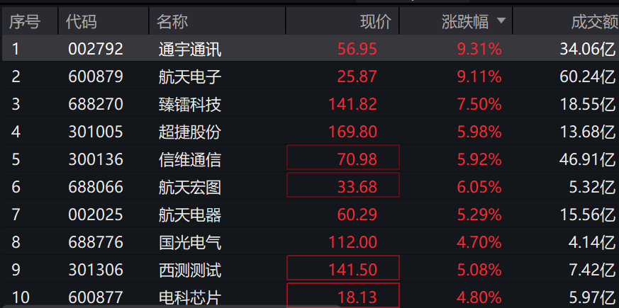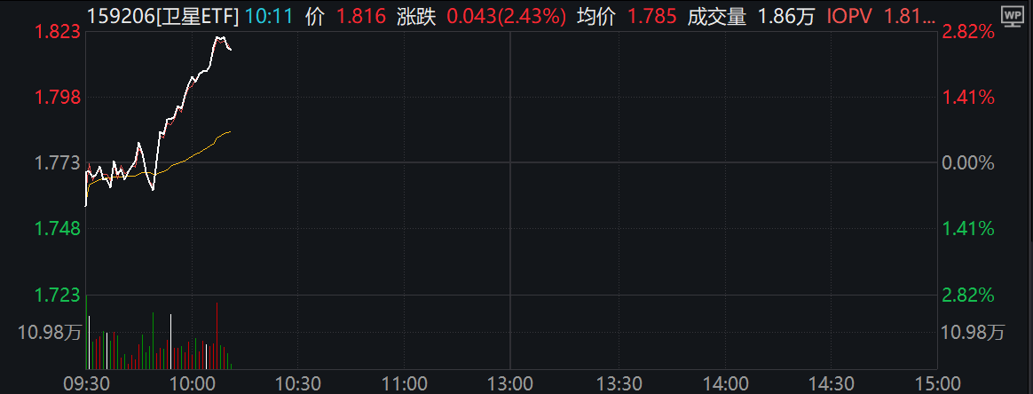 2026年1月8日,商业航天板块走强。截至10:11,卫星ETF(159206)上涨2.43%。成分股通宇通讯(002792)、航天电子(600879)涨超9%,臻镭科技(688270)涨超7%,航天宏图(688066),信维通信(300136)、超捷股份(301005)等个股跟涨。
