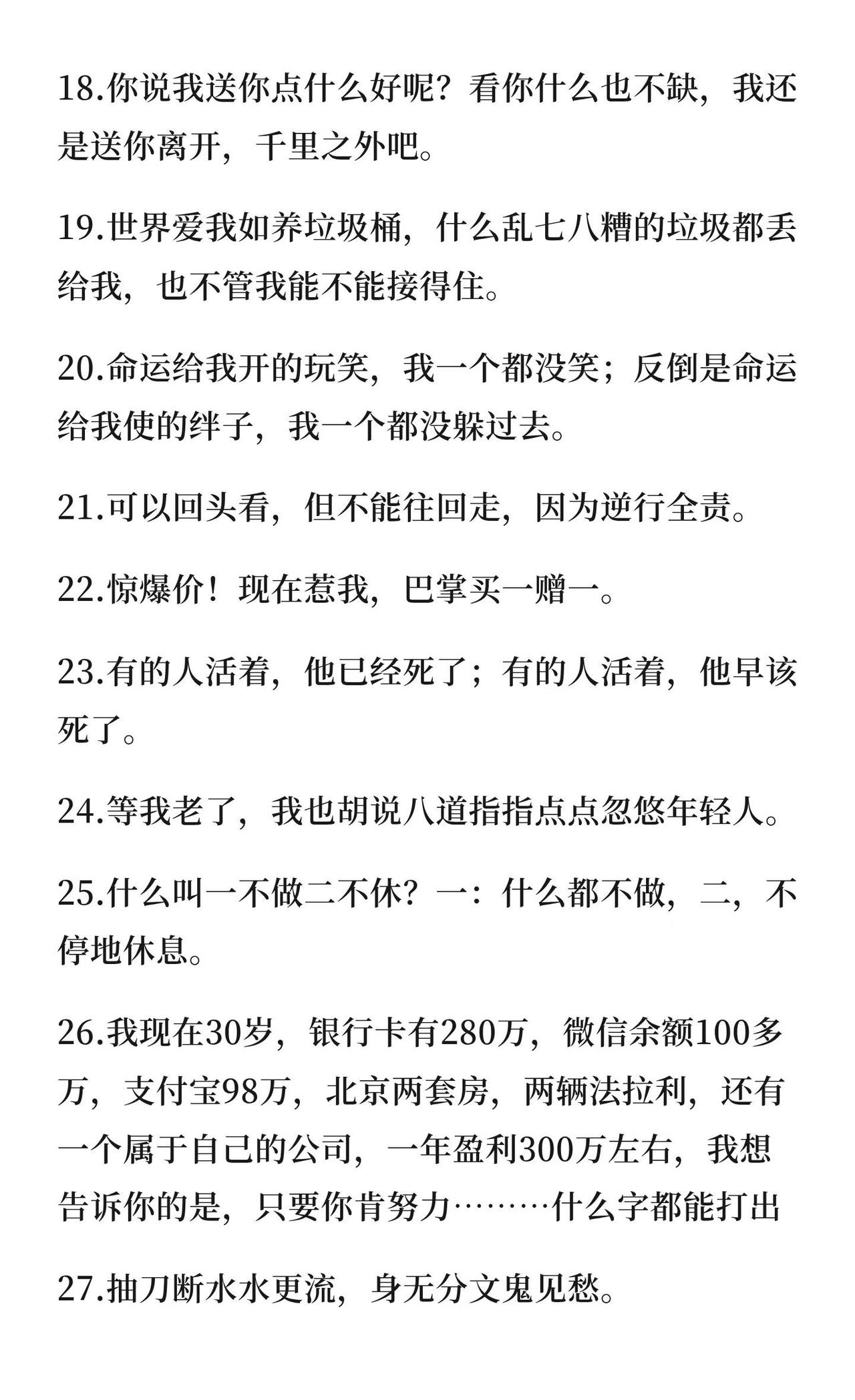 爆梗搞笑句子 爆梗搞笑句子:倔强的驴,颜控的狗,孤寡的姐,反诈的心,淬了毒的嘴,军书十二卷,卷卷有姐名。智者不入爱河,舔狗爱而不得,牛马点缀生活,怨种重蹈覆辙。关注直播话术 直播技巧 主播 主播培训 直播运营 新人直播 聊天技巧