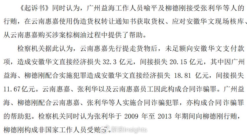 根据《起诉书》,2008年到2014年期间,广州益海作为中转仓储方,与安徽华文和云南惠嘉签订《中转协议书》,负责储存安徽华文代理云南惠嘉进口的棕榈油。检察机关认为,广州益海、原广州益海总经理柳德刚在此期间配合云南惠嘉及其负责人张利华等人实施合同诈骗犯罪,构成合同诈骗罪的帮助犯。该案造成的损失超过50亿元。