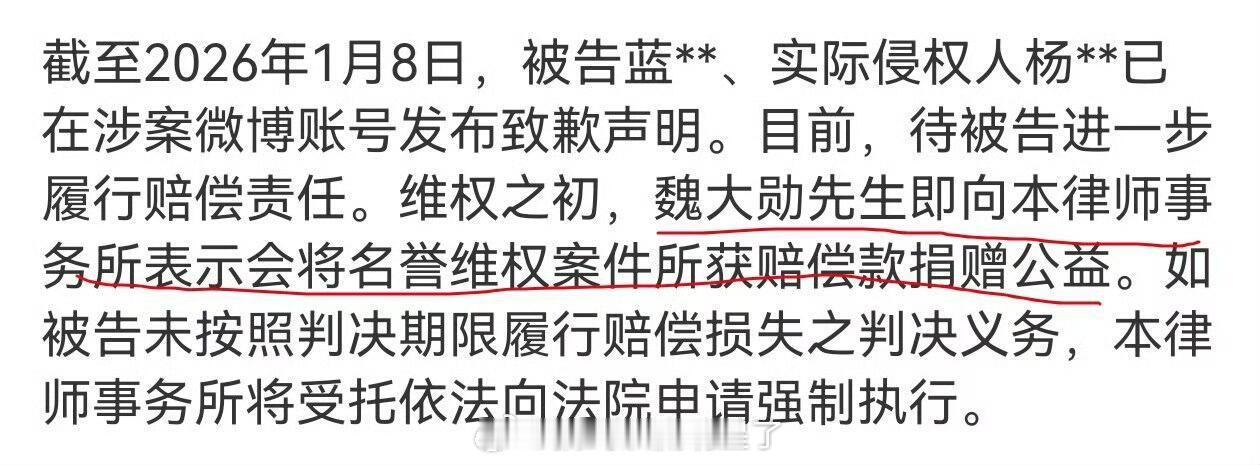 恭喜魏大勋告黑维权成功,黑子手写道歉信给魏大勋道歉并将进一步履行赔偿责任,魏大勋会把所获赔偿捐赠公益,好善良的大勋。支持魏大勋合法维权,网络非法外之地,希望大家都能谨言慎行!