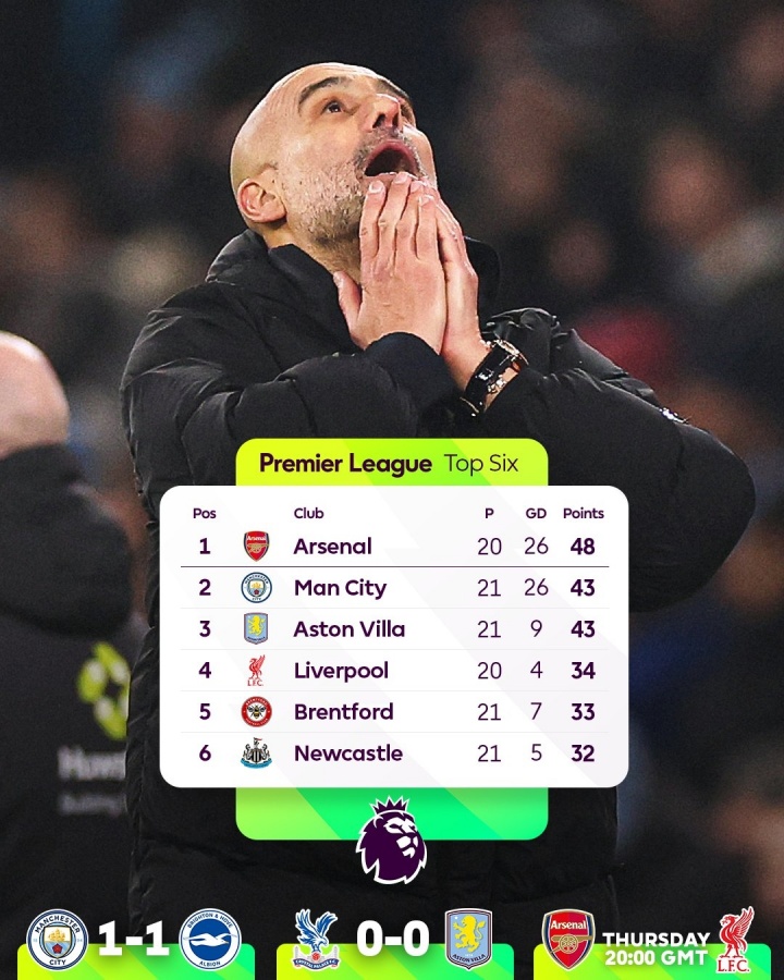 直播吧01月08日讯英超第21轮,曼城主场1-1战平布莱顿,维拉客场0-0战平水晶宫,曼城维拉仍同积43分,分列二三。