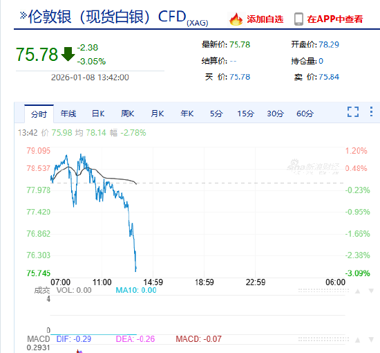 北京时间1月8日下午,现货白银继续下跌,跌破76美元/盎司,日内跌超3%,现报75.7672美元/盎司。