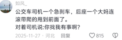 公交车司机一个急刹车,后座一个大妈连滚带爬的甩到前面了。对着司机说:你找我有事啊?