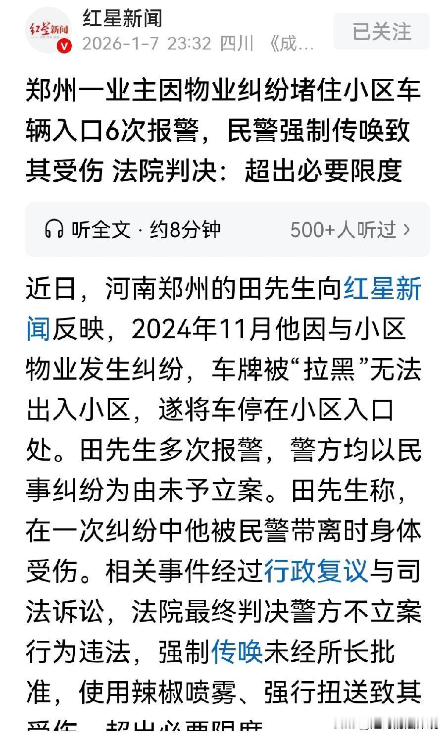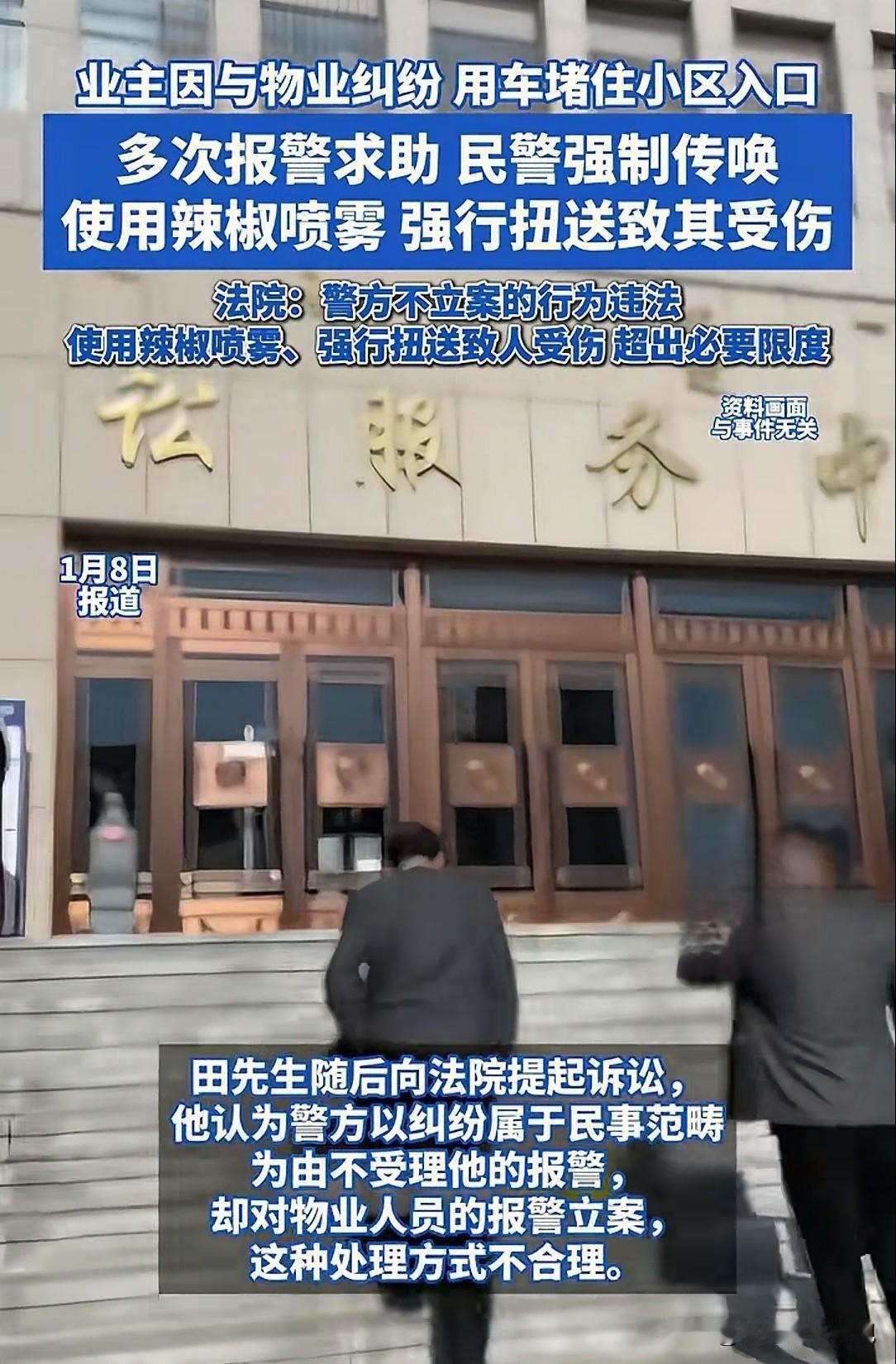 河南郑州,男子和物业有纠纷,被保安挡在门外不让进,他报了6次警,均未被立案。民警劝他挪车,两次警告后,男子不配合,民警对其使用了辣椒喷雾,并将他强制带离,后男子被诊断为右侧3根肋骨骨折。男子不服,自己报了6次警不立案,物业报警后,却对他立案调查,他认为警方的处置不合理,提起行政复议,却被两次驳回。男子告到法庭,法院判决,结局终于大反转! 田先生是某小区的业主,10年前,因黄标车淘汰,他将车交给了社区,拿到了500元的补贴。 社区曾承诺,其余的部分,以“终身免物业费”补偿给他。 新物业入住后,田先生仍多年未交物业费,车牌被物业拉黑。 2024年,田先生家的房子装修,他开车进小区搬东西。 物业说他没交物业费,多次不让他进小区。 11月24日那天,田先生的车又一次被小区保安拦下,他不服,和保安发生了争执。 田先生对物业的做法不认可,如果是因为自己不交物业费的问题,物业可以起诉,但不能不让他进出。 物业负责人表示,小区以前是由社区来管理。 老旧改造后物业入住,每月收取物业费,和车辆管理费。 但田先生自2021年至今,从没交过一分钱。 田先生称社区承诺过他可以终身免费,但他拿不出任何书面证明。 而且社区多次换届,老领导也否认有这个事儿。 2024年11月,田先生多次以搬东西为由,要求进入小区停车。 因为他的车牌被物业拉黑,保安不让他进。 田先生报警后,经过调解,物业才让他进去。 11月24日,田先生的车再次被保安拦住, 田先生气坏了,我自己买的房子,我自己的家,凭什么不让进? 他一气之下,将自己的车堵在小区门口,你不让我进,那就谁也别进! 田先生堵的是小区唯一进出口,其他业主的车被堵在小区外回不了家,人们纷纷抱怨,现场顿时乱成了一锅粥。 双方一直耗到了下午的6点多,物业报警。 民警到达后,对物业和田先生调解,劝田先生有事说事儿,先把车挪了。 不能因为个人的问题影响其他业主,但田先生也上了犟脾气,油盐不进,拒绝挪车。 民警又找物业劝导,但物业也态度强硬,拒绝调解。 民警再次口头告知田先生挪车后就走了。 田先生在当天5次报警,但警方以民事纠纷为由并未立案。 当晚9点多,因事情仍未解决,田先生第6次报警。 一名民警和一名辅警来到现场处理,但双方仍是谁也不让步。 民警劝导田先生挪车无效,认为田先生长时间拒不配合警方执法。 在两次对其警告后,民警使用了辣椒喷雾,并将田先生强制扭送带离现场。 直到11月25日,田先生终于从派出所出来,去了医院。 经诊断,田先生右侧第3、5、6肋骨骨折,伴有多处皮肤擦伤。 而让田先生愤愤不平的是,物业在11月3日报警称,他将车停在小区进出口4小时,影响了业主通行。 警方以扰乱公共场所秩序为由,对他立案调查。 而田先生多次报案,警方却并未立案,他认为警方处事不公。 事后,田先生向当地有关部门申请了行政复议,请求确认派出所的执法行为违法,并申请伤情鉴定。 但有关部门认定,他的堵门行为,可能违反了治安管理,警方的处置符合规定。 并且该行为不属于行政复议范围,两次驳回田先生的行政复议。 田先生不服,向法院提起诉讼。 陈先生认为,警方不受理他的报警,却对物业人员的报警立案,这种处理方式不合理。 法院审理后认为,田先生和物业发生纠纷,属于派出所管辖范围。 但派出所以不属于其管辖为由,未作出处理。 且在田先生多次报警求助时,未对拦截车辆的人员进行处理,该行为违法! 《治安管理处罚法》第82条 :需要传唤违反治安管理行为人接受调查的,经公安机关办案部门负责人批准,使用传唤证传唤。 对现场发现的违反治安管理行为人,经出示工作证件,可以口头传唤,但应当在询问笔录中注明。 公安机关应当将传唤的原因和依据告知被传唤人。对无正当理由不接受传唤或者逃避传唤的人,可以强制传唤。 民警对田先生进行强制传唤时,若未经派出所负责人批准。 直接使用辣椒喷雾,并强制带离导致其受伤,就违反上述条款。 《行政复议法》第2条:公民、法人或者其他组织认为具体行政行为侵犯其合法权益,向行政机关提出行政复议申请,行政机关受理行政复议申请、作出行政复议决定,适用本法。 田先生认为警方对其报警不立案、处置不公,有权申请行政复议。 该条款保障公民,通过复议维权的权利。 最终,法院判决,撤销有关部门的驳回行政复议决定书。 要求,警方在判决生效30日内对,该报案立案受理。 法院认为,复议决定认定该事项不属于行政复议范围,属适用法律错误,依法予以纠正! 2025年12月8日,河南高院指出,涉事派出所在处置中,单方面要求田先生挪车是否合理,有待商榷。 强制传唤,未经所长批准,使用辣椒喷雾、强制扭送至田先生受伤,超出必要限度。 对此你怎么看?