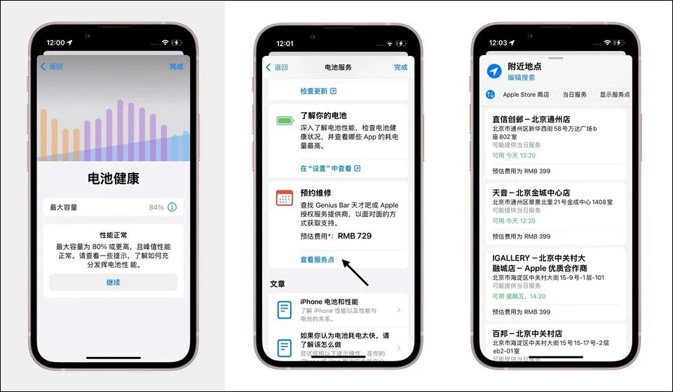 (5)选择“预约维修”查看服务点(这里可能会预估价格为729元,为AppleStore更换电池的原价格)