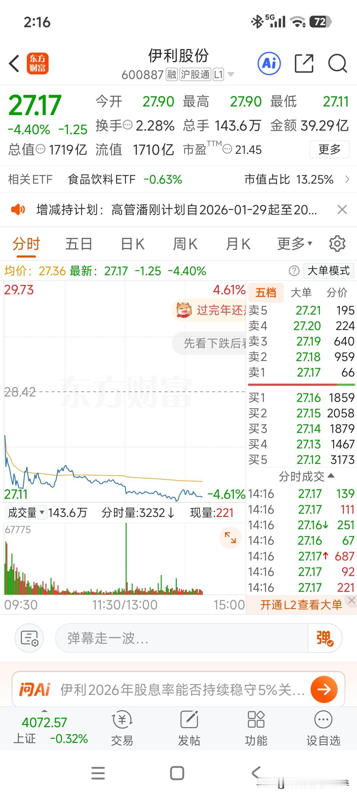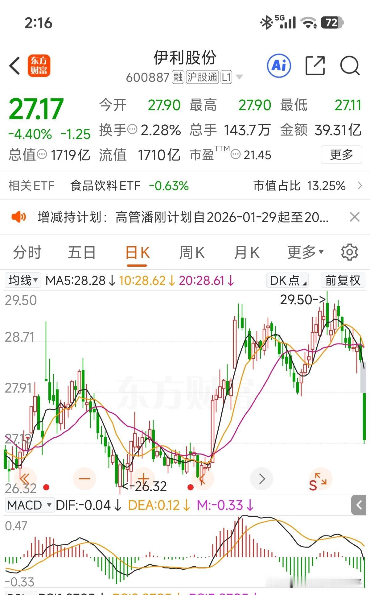 减持十几亿,市值缩水80亿[捂脸],昨天都说了,利空就是利空没必要把衰事喜唱,所谓的减持理由看看就行了没必要太当真! 潘董一年年薪2000万,股息4个亿,过去5年时间在伊利股份到手都快17亿,贷款不能延期? 当然过于恐慌不至于,减持不影响经营,不影响伊利股份今年利润超110亿以上,也不影响每股1.35元甚至以上的股息发放! 合规交易是散户也是高管的合法权益,不喜欢董事长减持的可以看看格力电器[捂脸],董明珠从不减持[呲牙]!