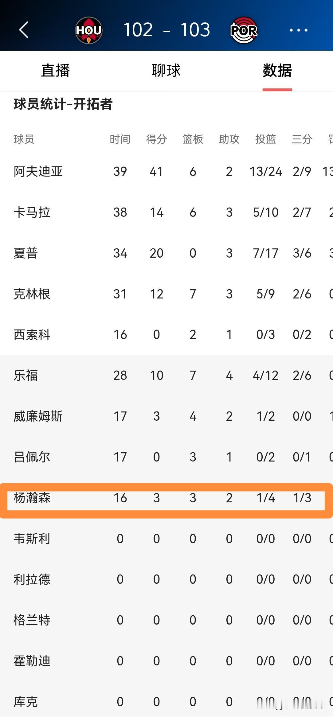 杨的表现一直很稳定,不管是上场几分钟还是十几分钟得分始终保持在5分以内[点赞]