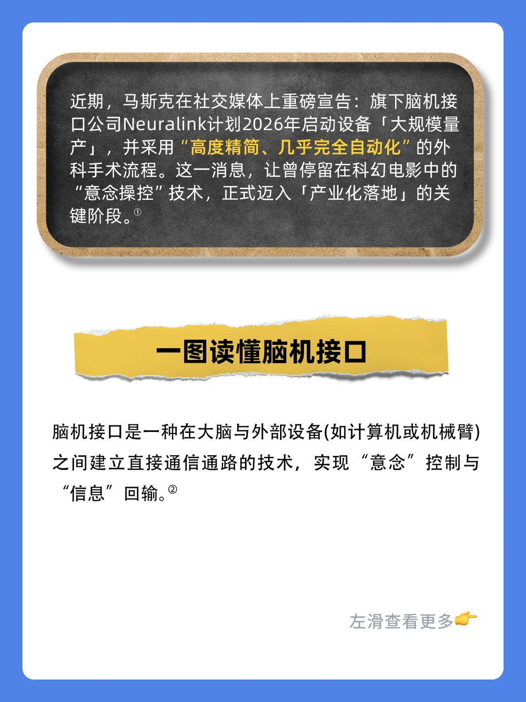 📅近期,马斯克在社交媒体上重磅宣告: 🤖旗下脑机接口公司Neuralink计划2026年启动设备「大规模量产」, 💡并采用“高度精简、几乎完全自动化”的外科手术流程。 🔮这一消息,让曾停留在科幻电影中的“意念操控”技术, 👉正式迈入「产业化落地」的关键阶段。