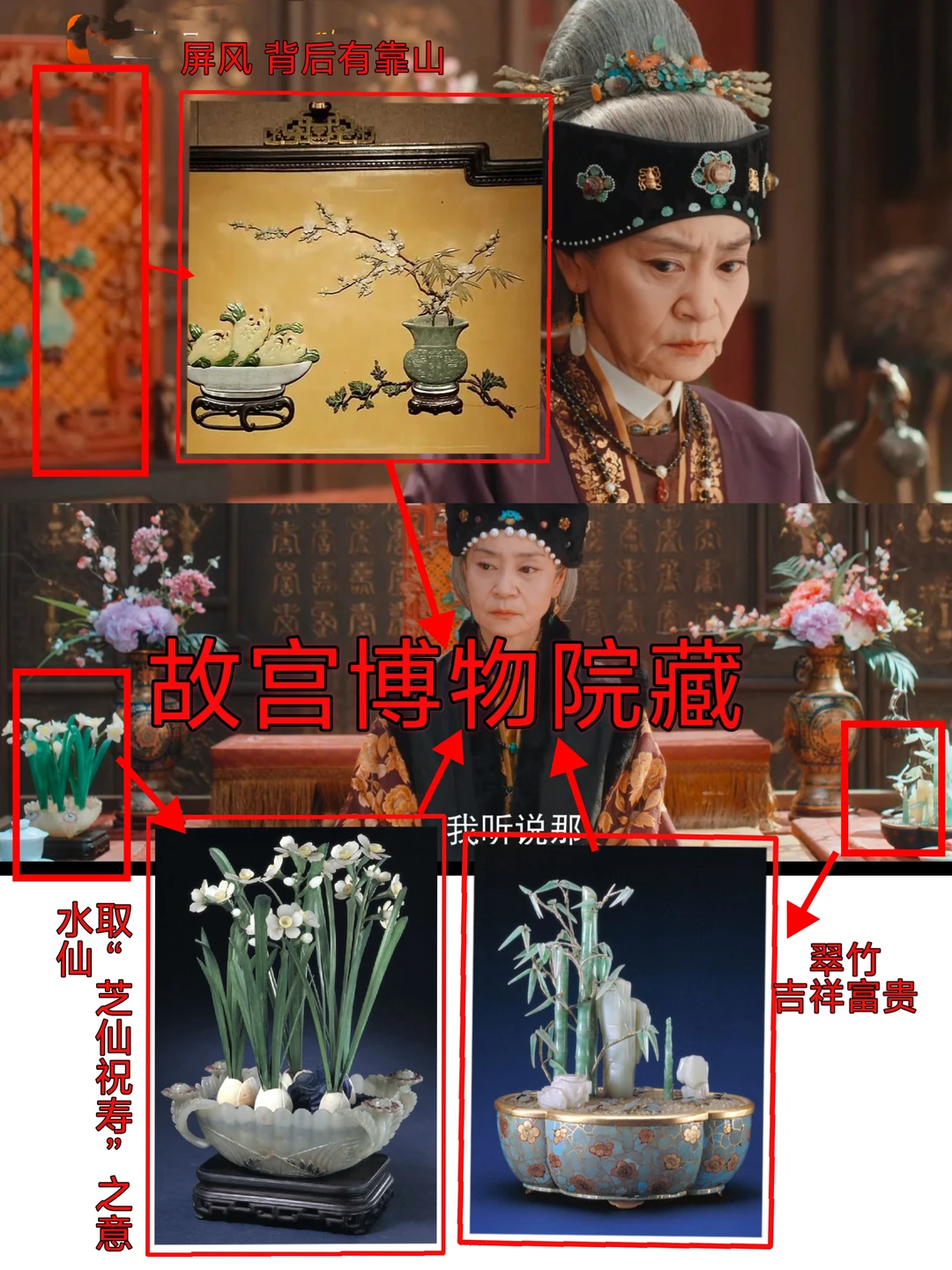 ⛰️背后的屏风是“后有靠山”的寓意,两侧的玉石盆景更讲究:左水仙是“芝仙祝寿”,右翠竹是祥和富贵🎍