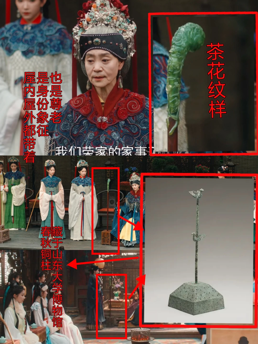 🌸手杖上的茶花纹样,原型居然是春秋邿国王墓出土的铜柱礼器!象征着老夫人荣府大家长的地位👑