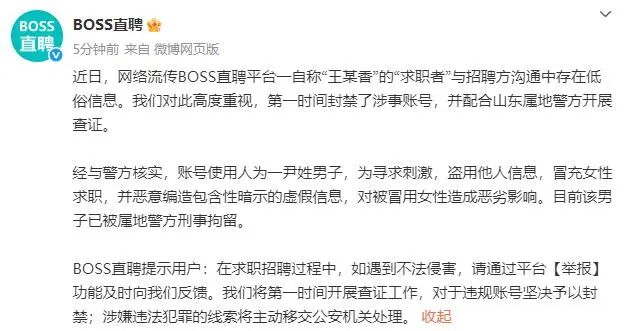 据BOSS直聘平台此前通报,经与警方核实,尹姓男子为寻求刺激,盗用他人信息,冒充女性求职,并恶意编造包含性暗示的虚假信息,对被冒用女性造成恶劣影响,已被属地警方刑事拘留。