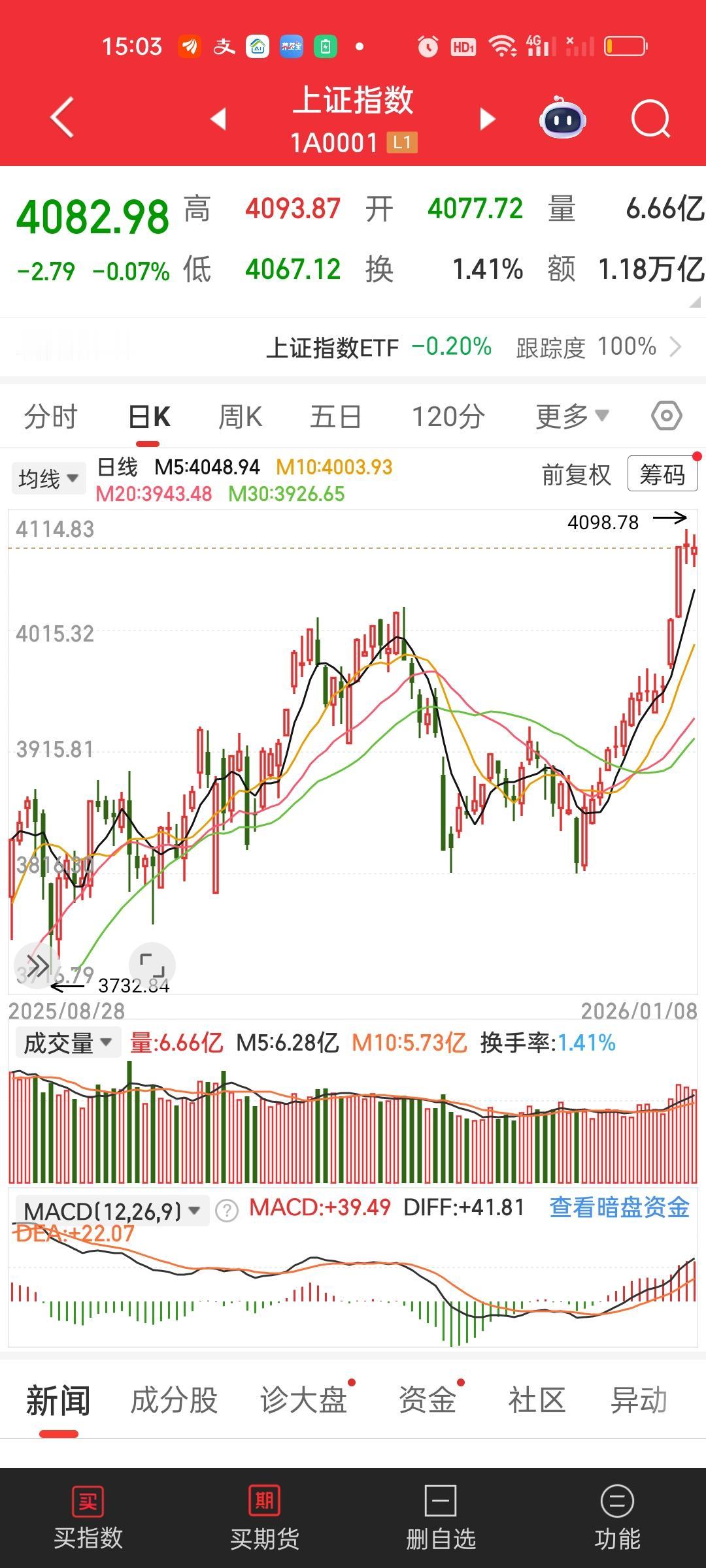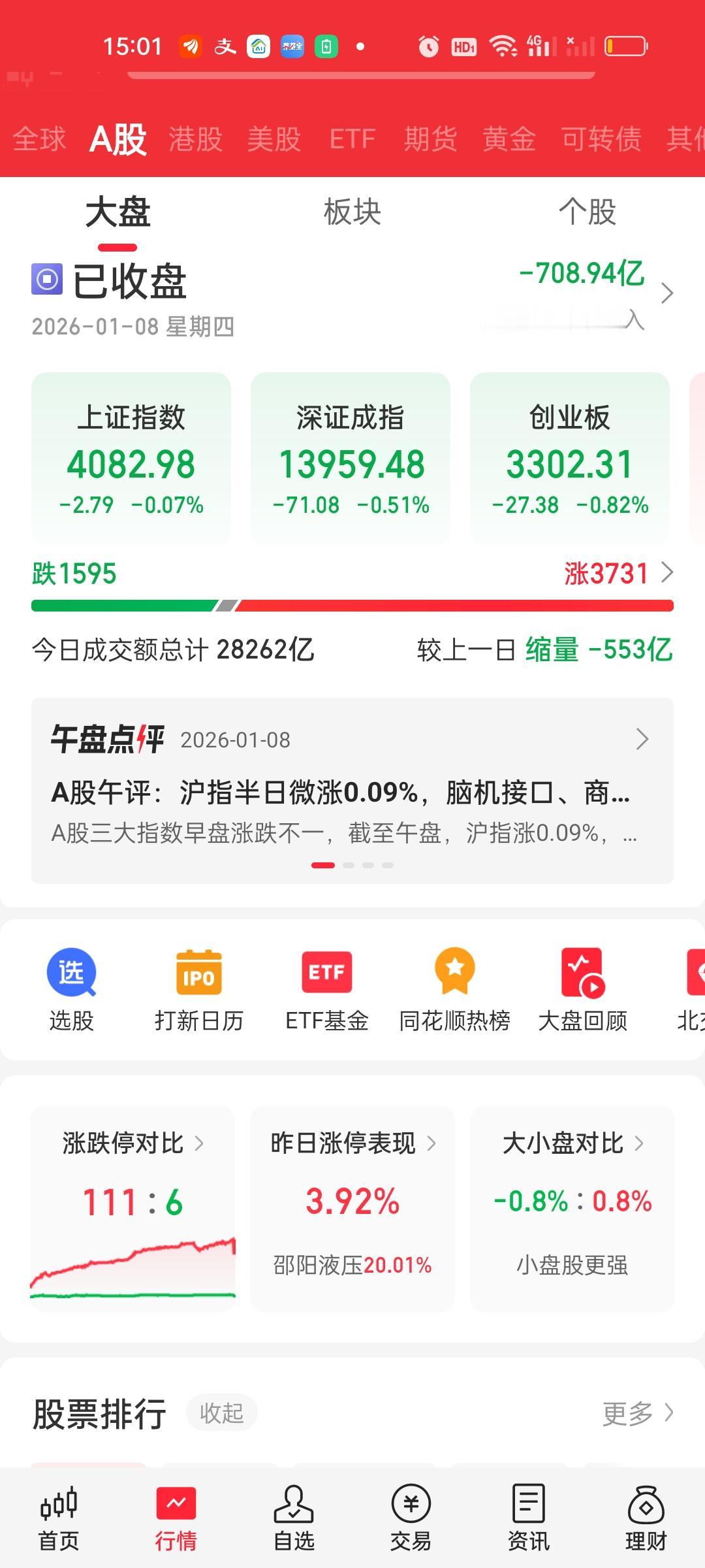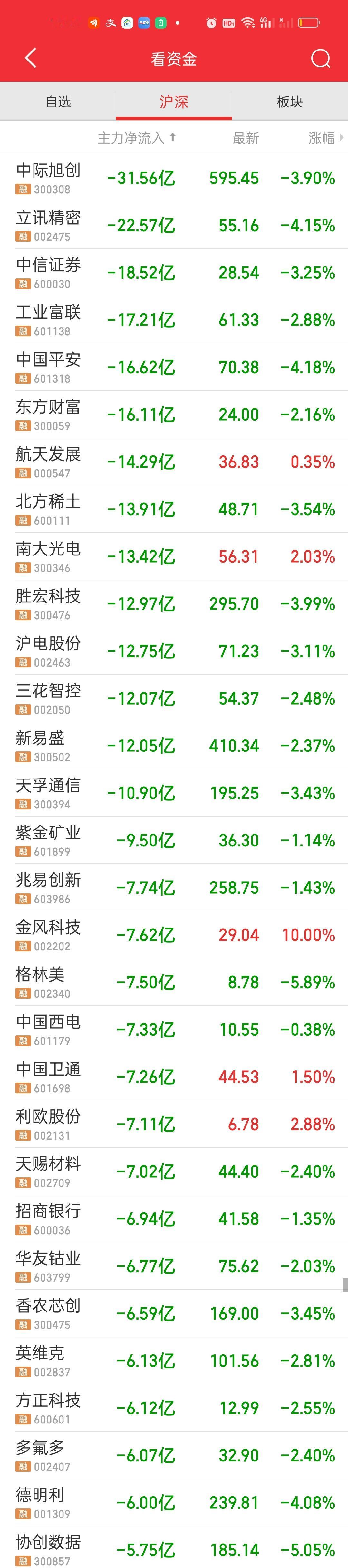 收盘了,早上这个低开的意图实在太明显了,说到底就是为了红盘而红盘,今天尽管指数收绿,但是大盘收了红盘,也就是说今天已经是15连阳了。从25年12月17红到了2026年1月8日,大盘确实走的豪横啊! 昨天收盘4085.77,今天开4077.72,低开了8.05点,假如今天4085平开,那收盘4082.98收的就是阴线。就差这一点点。那你就能想明白今天为什么要低开8个点了吧。 上午收盘缩量722亿,大盘资金净流出355.09亿,全天收盘缩量553亿,大盘资金净流出708.94亿,这说明下午实际上放量了722-553=169亿,但放量同时大盘资金也净流出了708.94-355.09=353.85亿。涨跌家数上午和下午没有太大变化,但涨停家数下午大幅增加了31家。跌停家数没有太大变化。 主力资金净流入方面,只有航天电子净流入超过10亿。但主力资金净流出方面上午只有6家净流出超过10亿,收盘有14家超过10亿,特别是中际旭创净流出达到恐怖的31.56亿,但股价只跌了3.90%,立讯精密大幅净流出22.57亿,股价下跌了4.15%。