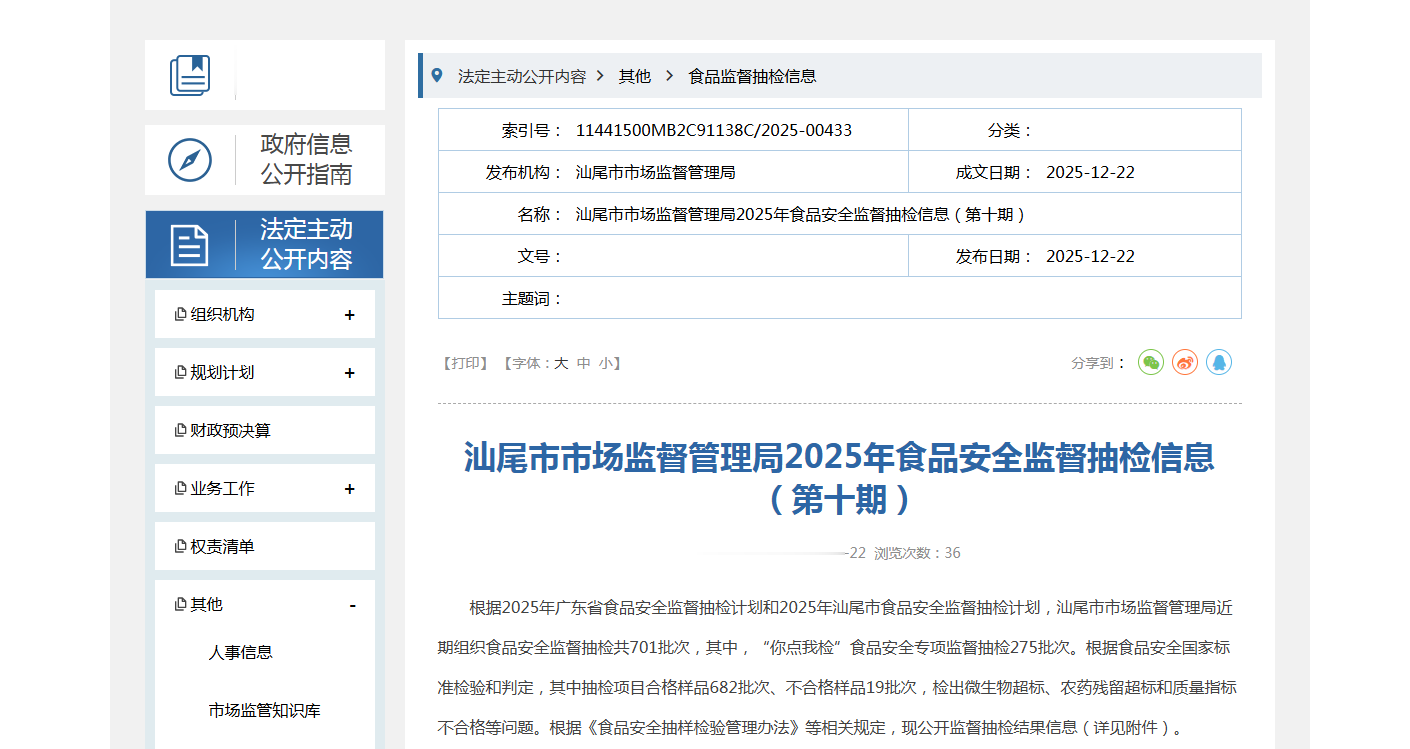 根据2025年广东省食品安全监督抽检计划和2025年汕尾市食品安全监督抽检计划,汕尾市市场监督管理局近期组织食品安全监督抽检共701批次,其中,“你点我检”食品安全专项监督抽检275批次。根据食品安全国家标准检验和判定,其中抽检项目合格样品682批次、不合格样品19批次,检出微生物超标、农药残留超标和质量指标不合格等问题。根据《食品安全抽样检验管理办法》等相关规定,现公开监督抽检结果信息(详见附件)。