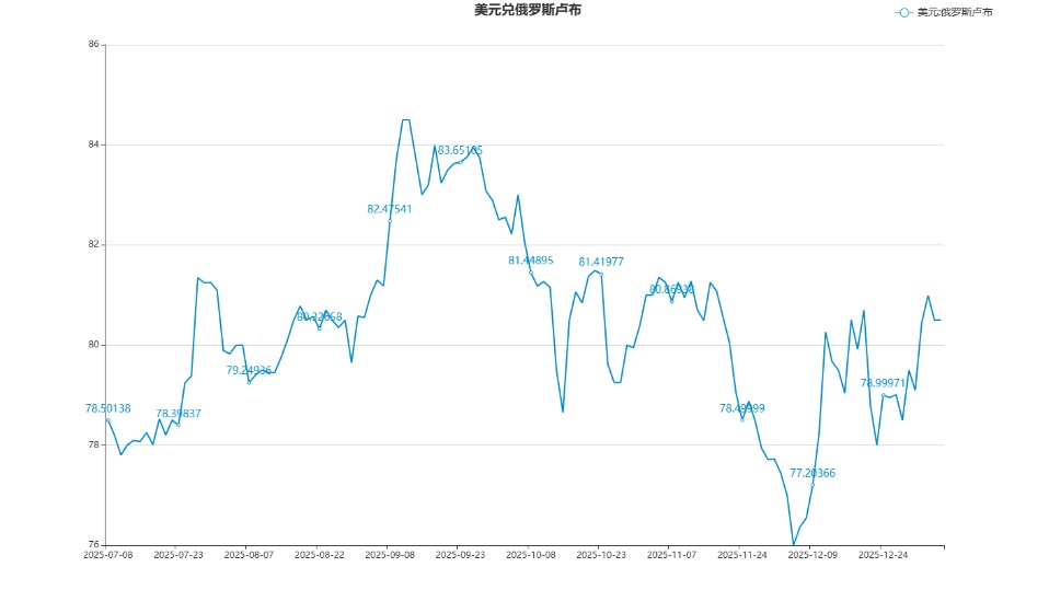 2025年初以来,市场基于多方面因素长期看衰卢布走势。油价走低、地缘政治局势复杂等不利因素叠加,均指向卢布走弱。然而,年末数据显示,美元兑卢布汇率稳定在1美元兑换80卢布以下,较年初1美元兑换100卢布以上水平显著走低。