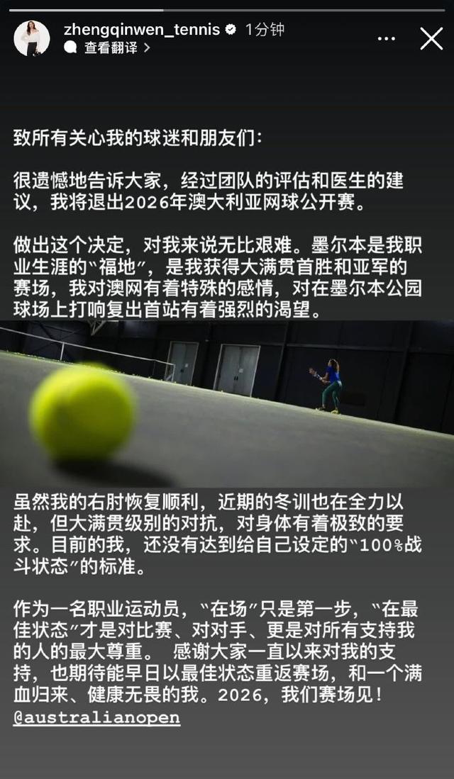 作为一名职业运动员,“在场”只是第一步,“在最佳状态”才是对比赛、对对手、更是对所有支持我的人的最大尊重。感谢大家一直以来对我的支持,也期待能早日以最佳状态重返赛场,和一个满血归来、健康无畏的我。2026,我们赛场见!