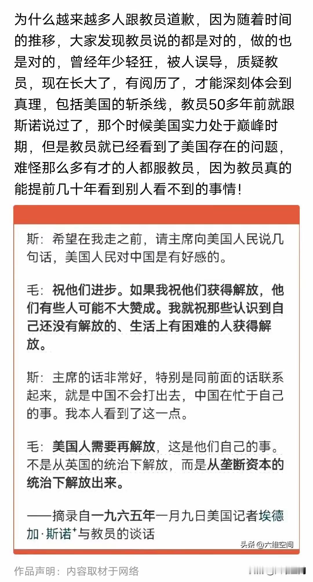 排队向教员道歉!这届年轻人终于读懂了50年前的远见 为啥现在的年轻人,扎堆给教员写道歉信?曾经被误导质疑的话语,如今全变成了“对不起,当年是我太年轻”。 这份集体道歉的背后,藏着一个震撼的真相:教员早在五六十年前,就看透了今天的国内外格局。美国国力如日中天时,他精准预判其“斩杀线”的必然存在;面对复杂的内外形势,他果断出手强力反击,掐灭了某些群体反扑的苗头。那些当年让人不解的决策,如今回头看,全是为后人筑牢根基的远见。 要知道,他的超前认知,连身边有才的同事都跟不上。他对人性的洞察、对历史规律的把握,放在今天依然一针见血。用他的哲学思想分析当下的困局,迷雾瞬间消散,一切都变得清晰通透。没有他当年的披荆斩棘,哪有我们如今安稳发展的底气? 从质疑到敬佩,从误解到读懂,这是年轻人阅历增长后的醒悟,更是对伟人智慧的深刻认同。教员从未远去,他的思想早已融入民族的血脉,指引着我们在风浪中辨明方向。这盛世,正如他所愿;这智慧,值得我们永远传承。 你是从哪个瞬间开始读懂教员的远见的?