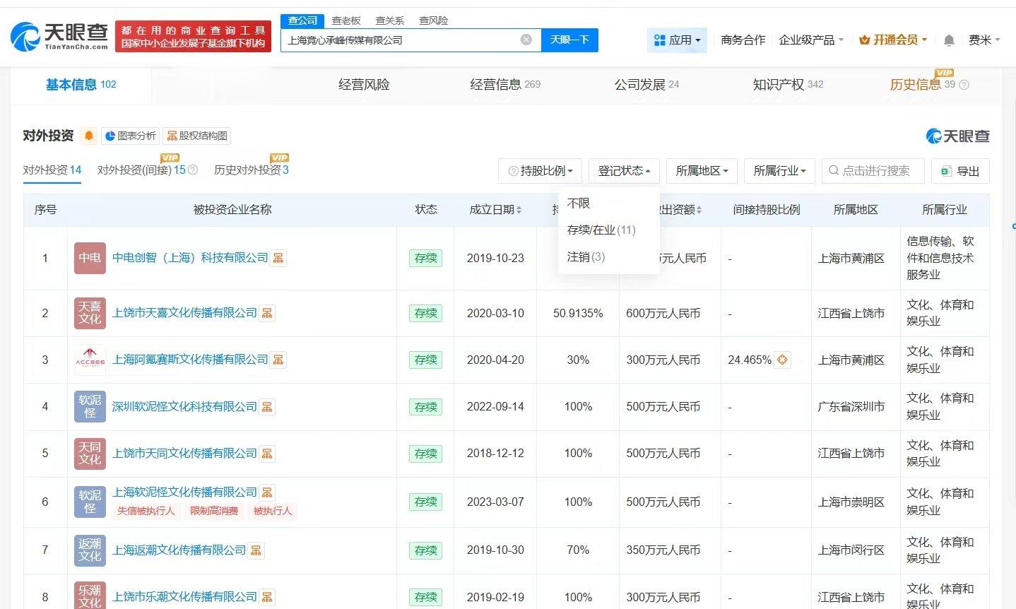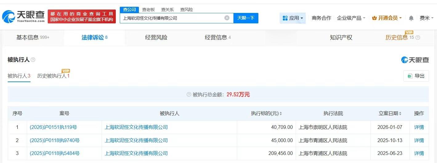 值得一提的是,1月7日,上海软泥怪文化传播有限公司新增一则被执行人信息,执行标的4万余元,执行法院为上海市崇明区人民法院。去年8月,上饶市天同文化传播有限公司新增一则破产审查案件,申请人为该公司,经办法院为江西省上饶市中级人民法院。