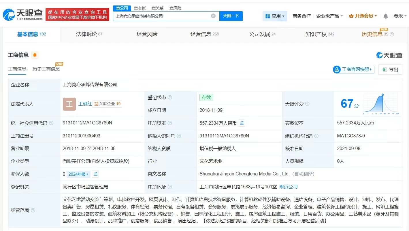 天眼查工商信息显示,RNG关联公司上海竞心承峰传媒有限公司成立于2018年11月,法定代表人为王俊红,注册资本约557万人民币,经营范围包括文化艺术活动交流与策划、电脑软件开发、计算机信息技术咨询服务等。股东信息显示,该公司由姚金成、海南鼎纯信息科技中心(有限合伙)、宁波太横企业管理咨询合伙企业(有限合伙)、王俊红共同持股。对外投资显示,该公司对外投资11家存续企业,包括上海软泥怪文化传播有限公司、上饶市天同文化传播有限公司、中电创智(上海)科技有限公司等。天眼风险信息显示,该公司被执行总金额超1.6亿元。
