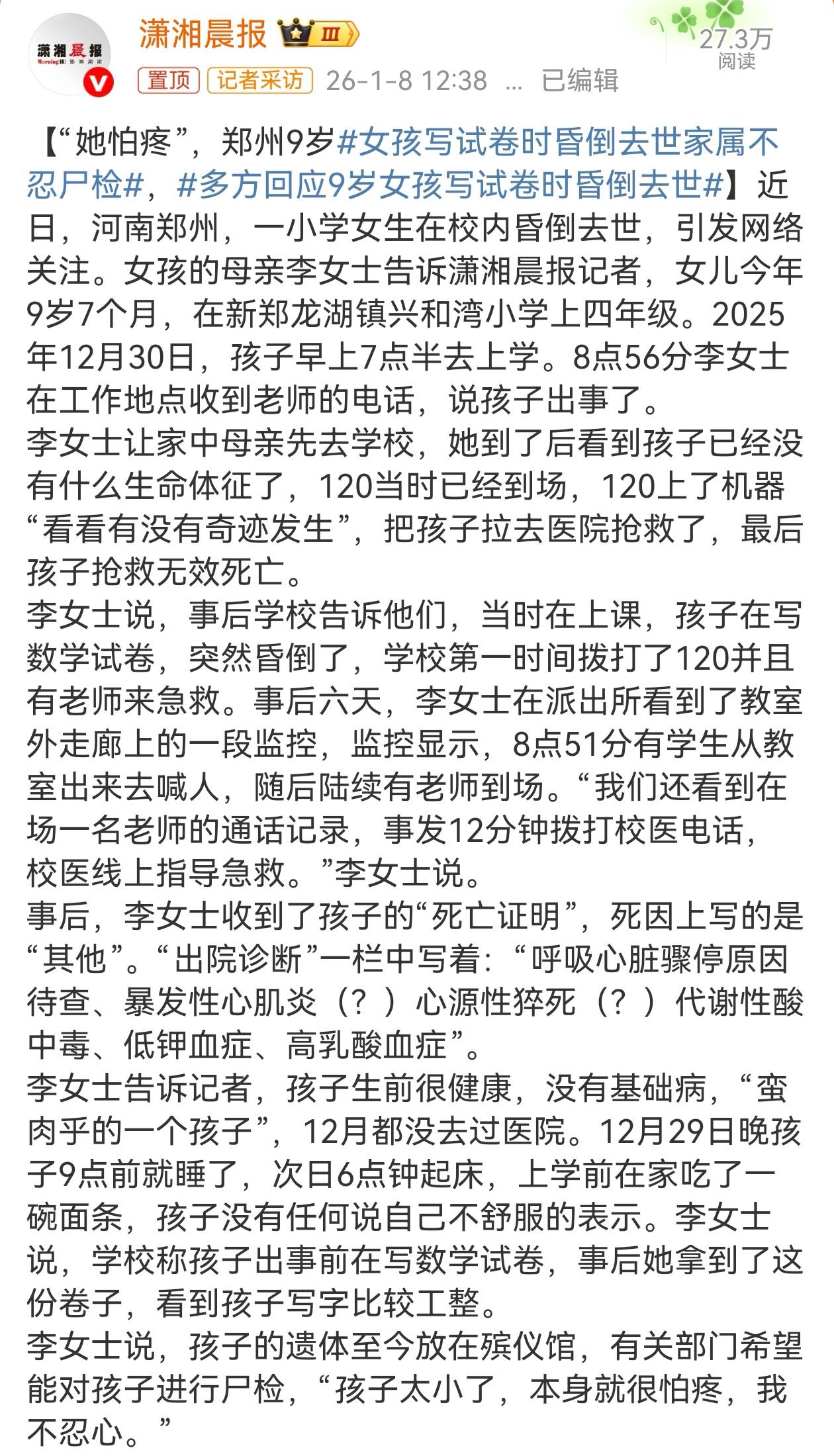太可怜了!安徽9岁小女孩在写数学卷子时突然晕倒之后抢救无效死亡。 老师是事发后12分钟拨打校医电话的,当时校医也只是给了远程指导救援,后来120到达现场已经无生命体征,拉到医院也没抢救过来。最后医院给的死亡证明原因写着“其他”。 而家长说孩子没有基础病心脏病之类的。目前陷入僵局,因为家长不同意尸检,所以不好查明原因,也不知道为什么家长不同意尸检?