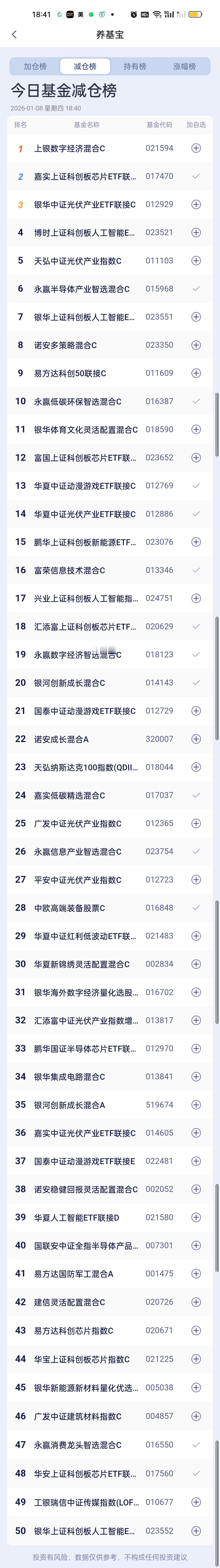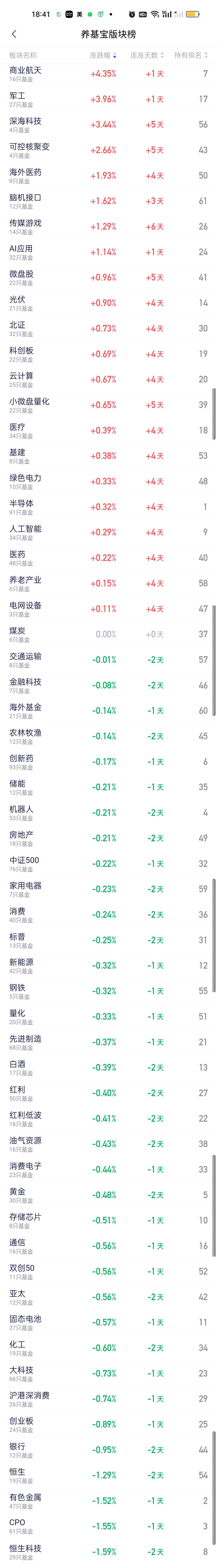 今日基金加仓榜,减仓榜,板块榜以及估值榜已全部更新完毕。加仓榜前三名是广发半导体材料设备,华夏上证科创板半导体材料,东方阿尔法科技优选。 减仓榜前三名是上银数字经济,嘉实上证科创板芯片,银华中证光伏产业。 板块榜来看,商业航天,军工,深海科技,可控核聚变,海外医药,脑机接口,传媒游戏,AI应用涨幅居前。
