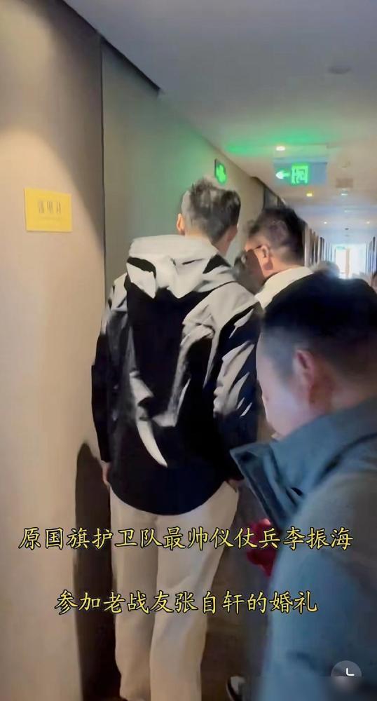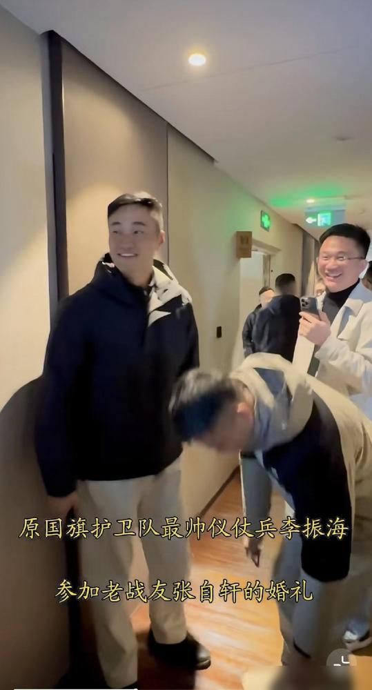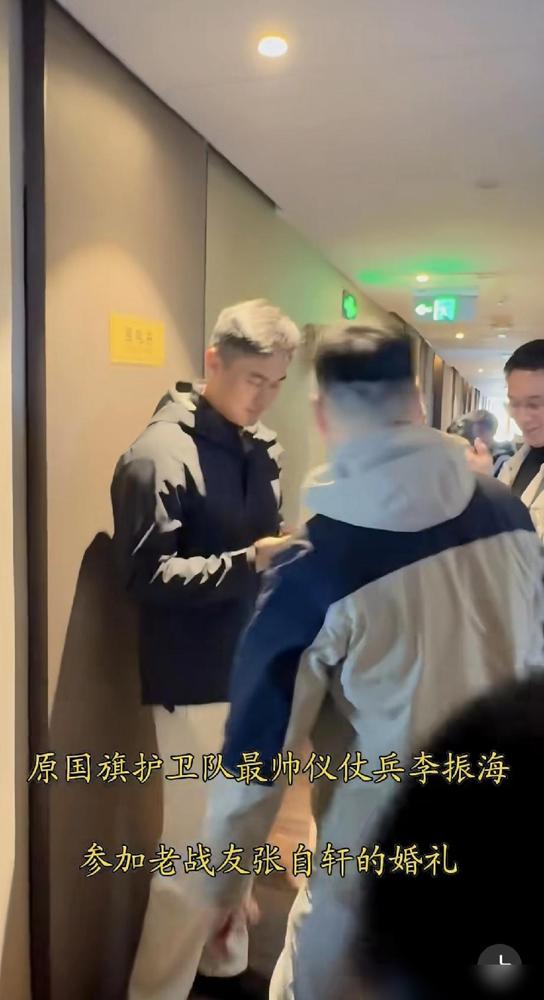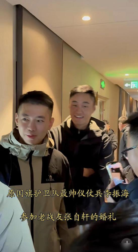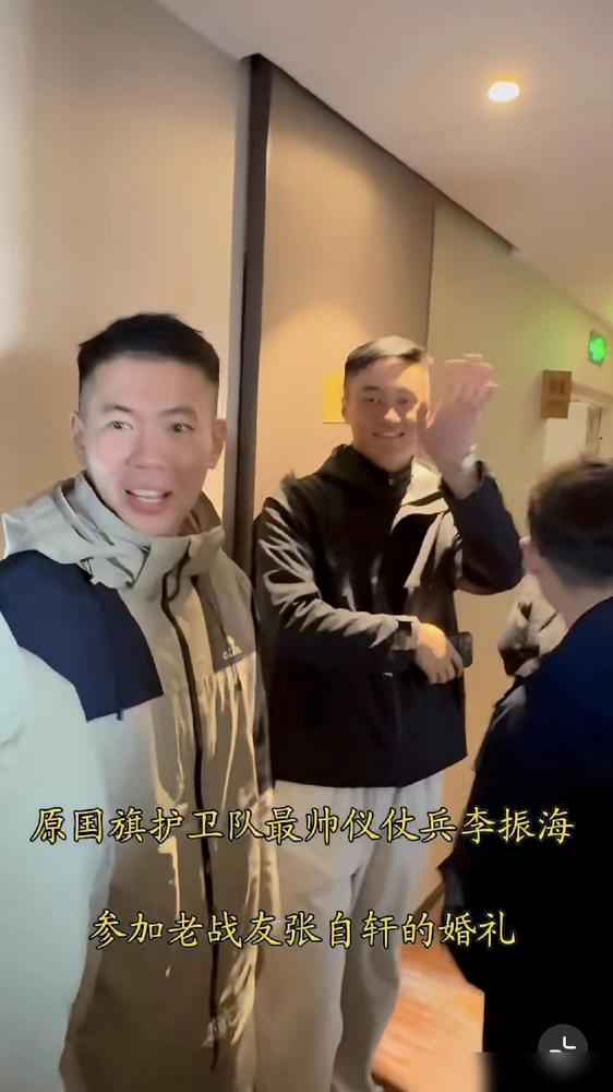 原国旗护卫队升旗手张自轩结婚,另外一位护卫队大帅哥李振海过来了,他同样退役了,穿着私服站在酒店里准备参加婚礼,身材高大挺拔牙齿好白,就算年龄大了一样帅气,一看就是当过兵的。 1月7号这场在河北邢台举办的婚礼,在当地那是相当轰动,毕竟张自轩可是大家看着成长起来的。这哥们儿退役后回了老家,不仅在统战部工作,还成了拥有百万粉丝的助农网红,帮乡亲们直播卖货,确实挺实在的。 让我感触最深的是,虽然早就脱下了军装回归平凡生活,张自轩迎亲时还是坚持穿上那一身戎装。这种对老身份的执着,不仅是仪式感,更是一种刻在骨子里的情怀吧。 特意跑来捧场的李振海也是焦点,他当年可是被称为“最帅仪仗兵”的存在。1米92的身高往那一站,即便穿的是最普通的休闲私服,那种压倒性的气场也瞬间让周围人显得娇小了不少。 说实话,退役这几年他确实成熟了不少,皮肤晒得黑了,脸型也比以前硬朗,但那口大白牙和灿烂的笑容一点都没变。这种反差感反而更有男人味,这就是大家常说的岁月沉淀下来的稳重吧。 我更在意的一个细节是李振海的背影,哪怕是随意站着或者扭个身,背部线条依然直得像标杆一样。这种状态真不是短时间能练出来的,完全是纪律部队留下的肌肉记忆,这辈子估计都难改了。 以前他们在天安门广场护卫国旗,现在一个在基层助农,一个在享受普通人的生活。虽然职业变了,但这股子精气神儿哪怕是在人群里,也能让人一眼认出这就是当年的中国军人。 看到昔日战友在人生重要时刻重聚,真的挺替他们高兴。比起那些流量明星,这种健康、阳光、挺拔的帅气,才是最值得咱们点赞的。