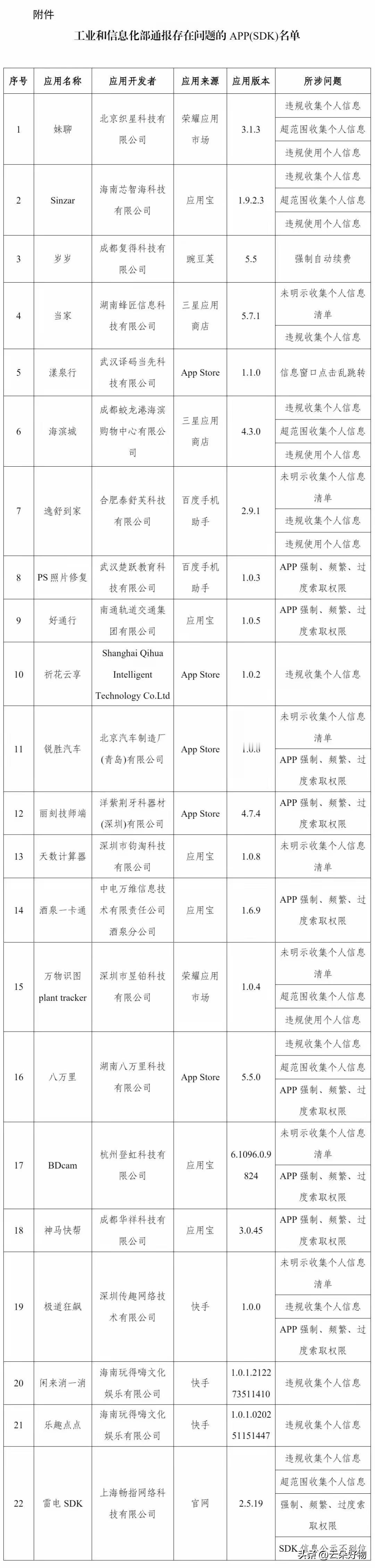 赶紧卸载别犹豫!赶紧自查!这22款APP被曝“偷家”! 家人们,手机里有这几款APP的,赶紧删!就在昨天(1月6日),工信部一记重拳,直接通报了22款侵害用户权益的APP和软件工具包(SDK)。这可不是小打小闹,而是实打实的“流氓行为”曝光! 这次被点名的“坏分子”里,有叫“妹聊”的,有叫“SinZar”的,还有“当家”、“漾泉行”、“海滨城”等等。它们干了啥坏事?简直是把咱们当“韭菜”割! 第一宗罪:强买强卖! 像“岁岁”、“豌豆荚”这几款,搞什么强制自动续费!字小坑多,一不小心钱就没了,想取消?比登天还难! 第二宗罪:窥探隐私! 很多软件明明只是个手电筒或者计算器,却非要索要你的通讯录、位置信息,比查户口还勤快,这就是违规收集个人信息! 第三宗罪:弹窗轰炸! 用着用着突然跳转广告,关都关不掉,严重干扰使用体验。 官方已经下令整改,整改不到位就要下架!为了咱们的钱包和手机安全,建议大家立刻打开手机对照自查。别存侥幸心理,这些“吸血”APP,留着就是给自己的生活添堵!赶紧转发给家人朋友,特别是家里的老人,别让他们中了招!