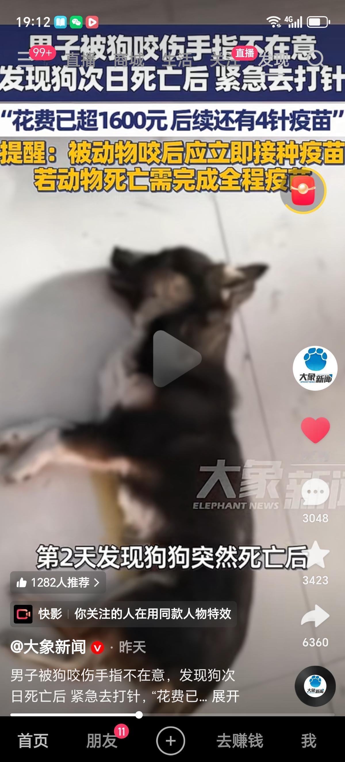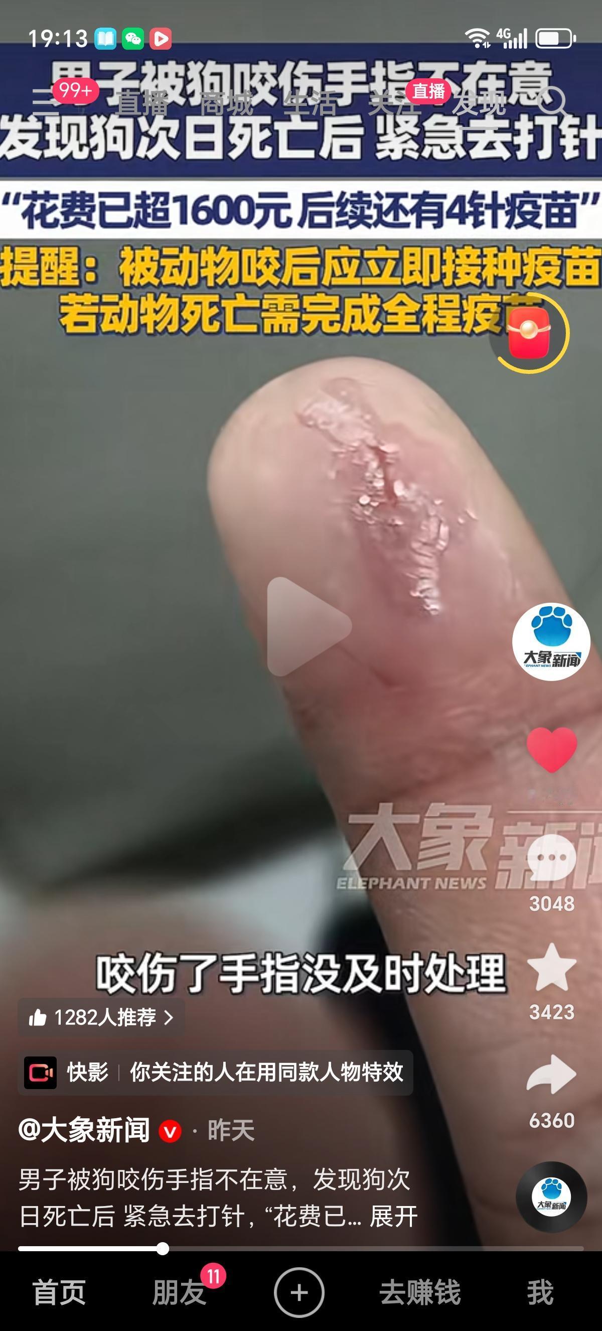 河南周口的李先生被自己养了半年的狗把手指咬伤了,没当回事,也就没有及时处理,结果狗第二天就死了,把李先生吓的够呛,赶紧去看大夫,接种了首针疫苗、血清和免疫球蛋白,后边还要接种4针,花费超过1600元。 有人要问了,为啥狗咬人,反而狗死了? 有经验的网友就会知道,狂犬病发作的狗狗基本都会死,从有明显症状到死亡,通常2到3天就会死,极少能活过5天的。 病狗会先表现出狂躁、攻击性强、流涎、怕光怕水等症状,随后快速发展为全身麻痹、呼吸困难,最终因呼吸和心跳衰竭死亡。