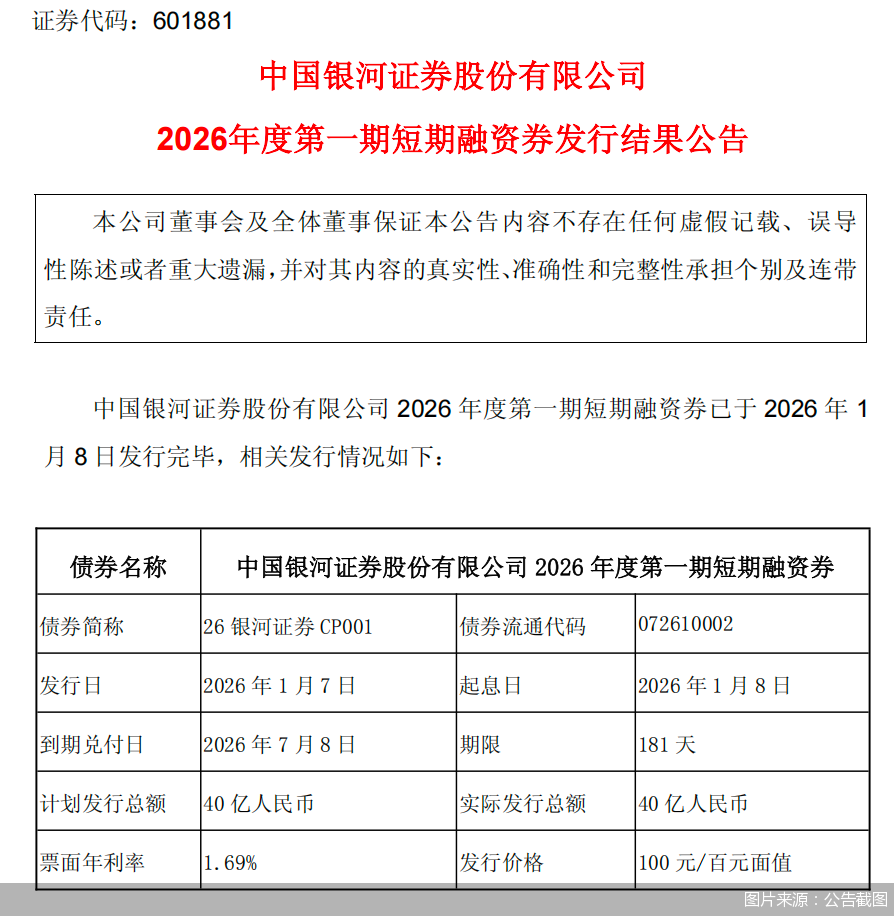 北京商报讯(记者刘宇阳实习生姚榕琰)1月8日,中国银河证券发布公告,公司2026年度第一期短期融资券已于1月8日发行完毕。