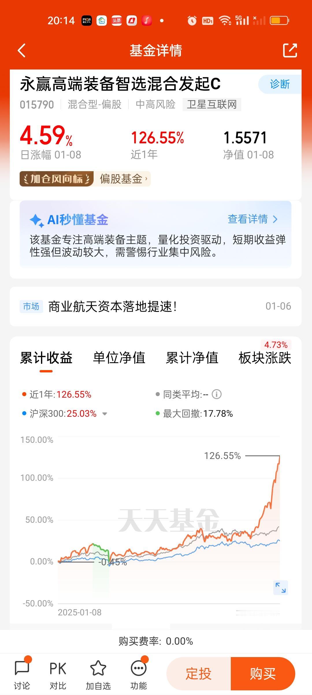 既然打不过那就只能加入了,我是这么说的也是这么做的,言出必践自然如此。我是25年12月23日大跌4.64%的时候买进的底仓,那天也是我第一次做商业航天板块。三天后背着1.50%的手续费清的仓,尽管3天时间就挣了18%,但现在回头来看这是一次彻头彻尾失败的操作。我的格局还是太小了。因为是复利,你的本金在放大,实际损失远远不止20%。 一直在等待第二次进场的机会,昨天预估跌2点5,终于等到进场的机会,可是来了个超级高开,最后只跌了0.51%,商业航天半年时间涨了100%,目前依旧处在暴涨行情中,是不是和早期的机器人,CPO很像啊? 很少有连续两年涨相同板块的,今年大概率会是新的板块崛起,之前在25年暴涨过的板块今年表现不会太好了,商业航天现在已经确定是主线无疑了,这一点毫无争议,但就算是主线,操作也需要注意节奏。