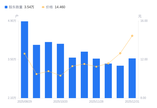日期A股户数(户)流通A股户均持股数(股)户均持股市值(万元)2025-12-31354167580.2610.962025-12-19327618194.5810.372025-12-10335378004.969.282025-11-28353427596.138.552025-11-20378657089.998.182025-11-10356837523.548.512025-10-20407186593.216.812025-09-30413466493.077.012025-09-19403206658.306.982025-08-29488765492.736.93