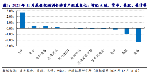 收益的背后是基金投顾的积极调仓。同源数据显示,2025年12月共有178只基金投顾组合调仓,且主要增配了A股、黄金等资产,减配了债券、美股等资产。其中,其对A股的增配幅度大幅超过其他资产,接近3%,而这已经是基金投顾组合连续两个月增配A股资产。
