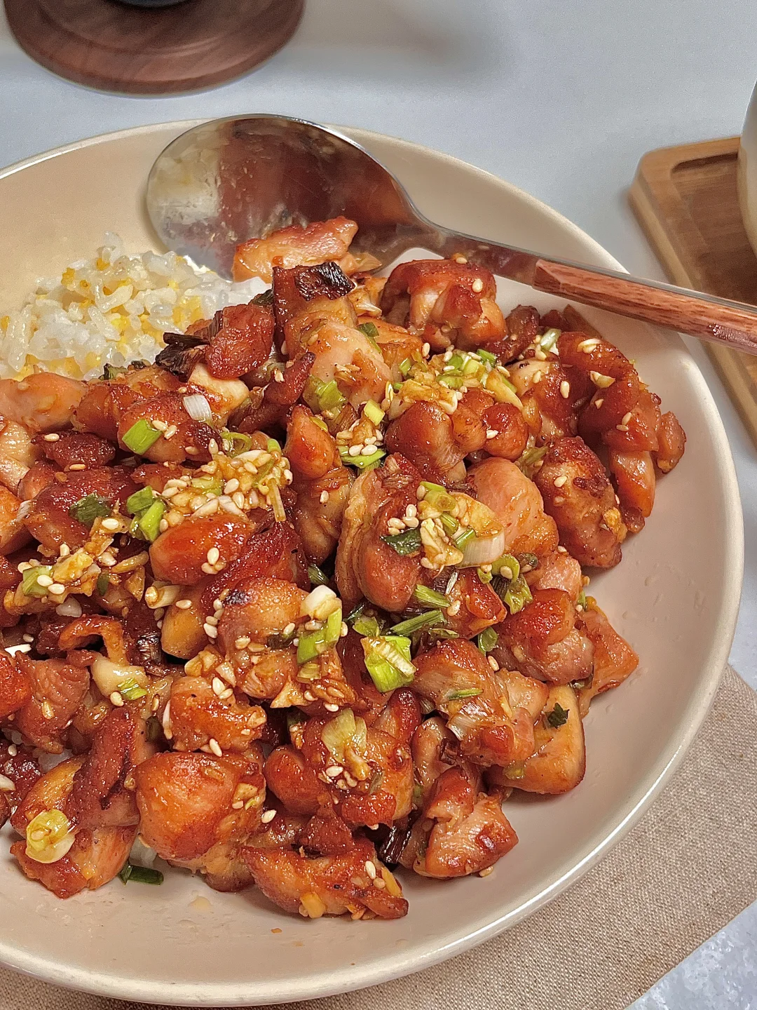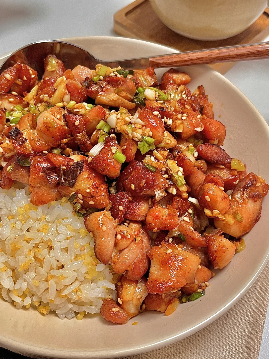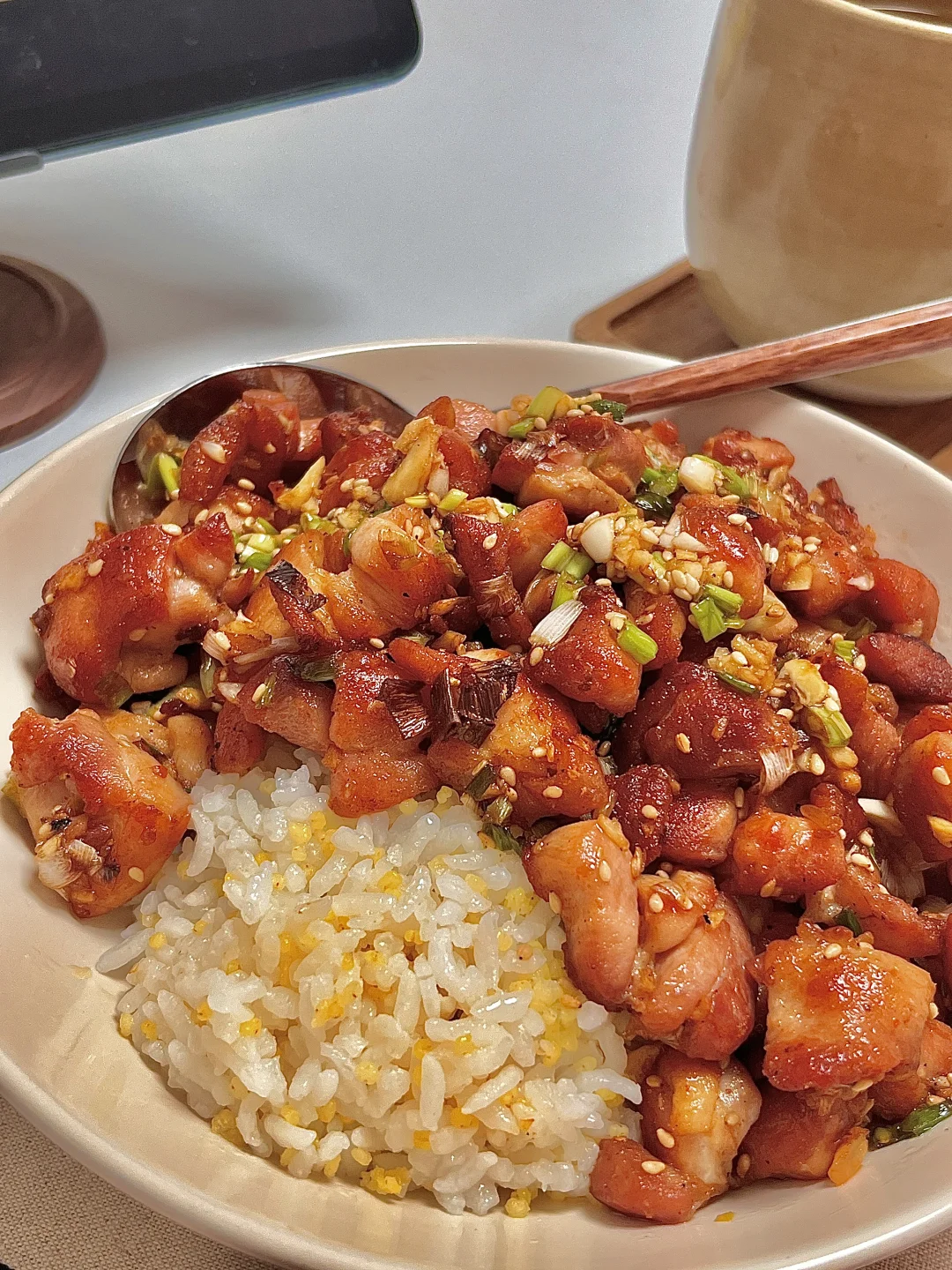🍴今日份一人食: 盐葱烧鸡腿饭 椰子水🥥 . 鸡腿肉是怎么做都好吃的😋今天吃盐葱烧鸡腿肉, 鸡腿肉煎焦焦的,放多多的葱段爆锅,再加上盐葱酱焖一焖真的巨香,一口肉一口饭,香迷糊啦~ 爱吃的宝一定要去试试呀✌🏻