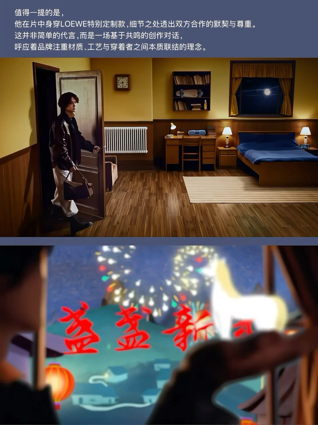 王一博在动画创意片中的温暖笑容,与他平时冷静专注的形象形成微妙反差,却恰恰展现了他性格中的多面性——专注时的“酷”与共鸣时的“暖”同样真实。这种真实感正是LOEWE所珍视的品牌精神:注重材质、工艺与穿着者之间的本质连接。重点是,王一博在动画创意片中身穿品牌特别定制的服装、Puzzle手袋搭配可爱温暖的小马挂件,处处传递着LOEWE的新春祝愿,这些细节无声印证了双方合作的深度。这不是简单的商业代言,而是基于相互理解与尊重的创作对话。