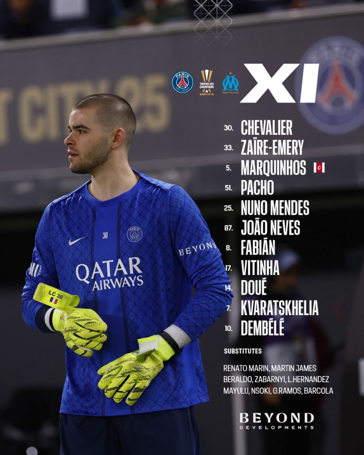 30-舍瓦利耶、33-扎伊尔·埃梅里、5-马尔基尼奥斯、51-帕乔、25-努诺·门德斯、87-若昂·内维斯、8-法比安·鲁伊斯、17-维蒂尼亚、14-杜埃、7-克瓦拉茨赫利亚、10-登贝莱