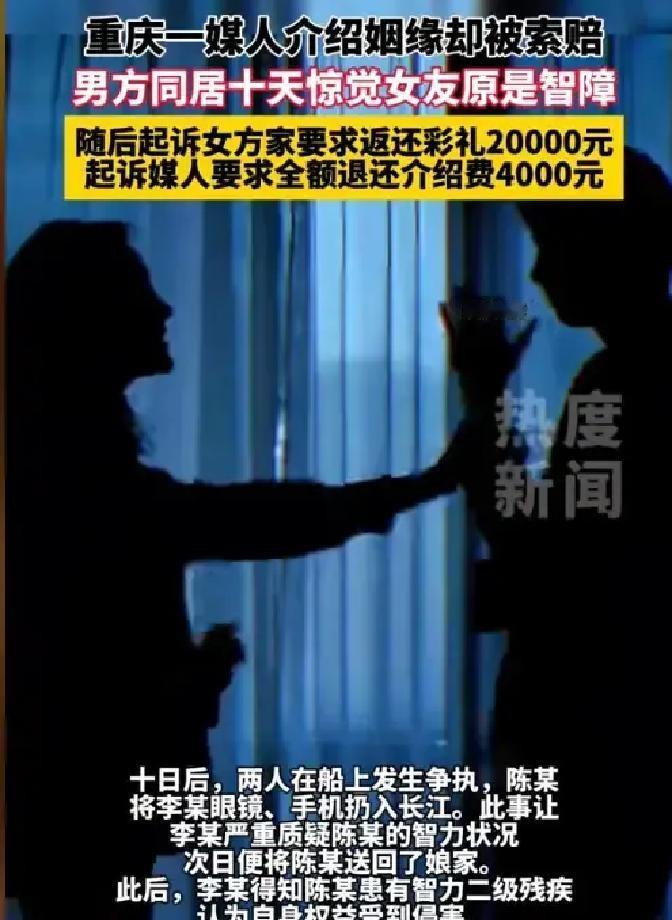 重庆李先生相亲三天就掏2万彩礼加4000介绍费,结果同居后发现女方是二级智力障碍,连自己名字都说不清。 媒人王某收钱时拍胸脯说姑娘只是腼腆,陈家也闭口不提残疾证的事。 李先生打官司,法院判陈家退1万、媒人退2千,理由是同居过只能退一半。 钱没全拿回来,婚事也黄了,农村大龄男想成个家,一急就掉进这种坑。 急着结婚没错,可信息不透明就是坑。 彩礼不是不能给,得先看清对面是谁。