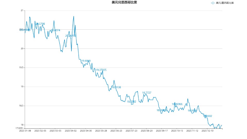 四季度以来,比索重新走强成为市场共识。墨西哥媒体《Infobae》数据显示,2025年12月中旬,美元兑比索多个交易日在18附近运行,部分交易日甚至短暂跌破18整数关口。综合全年走势,美元兑比索从年初约20.50水平下行至年末的17.88,创下自2024年7月以来的新低。